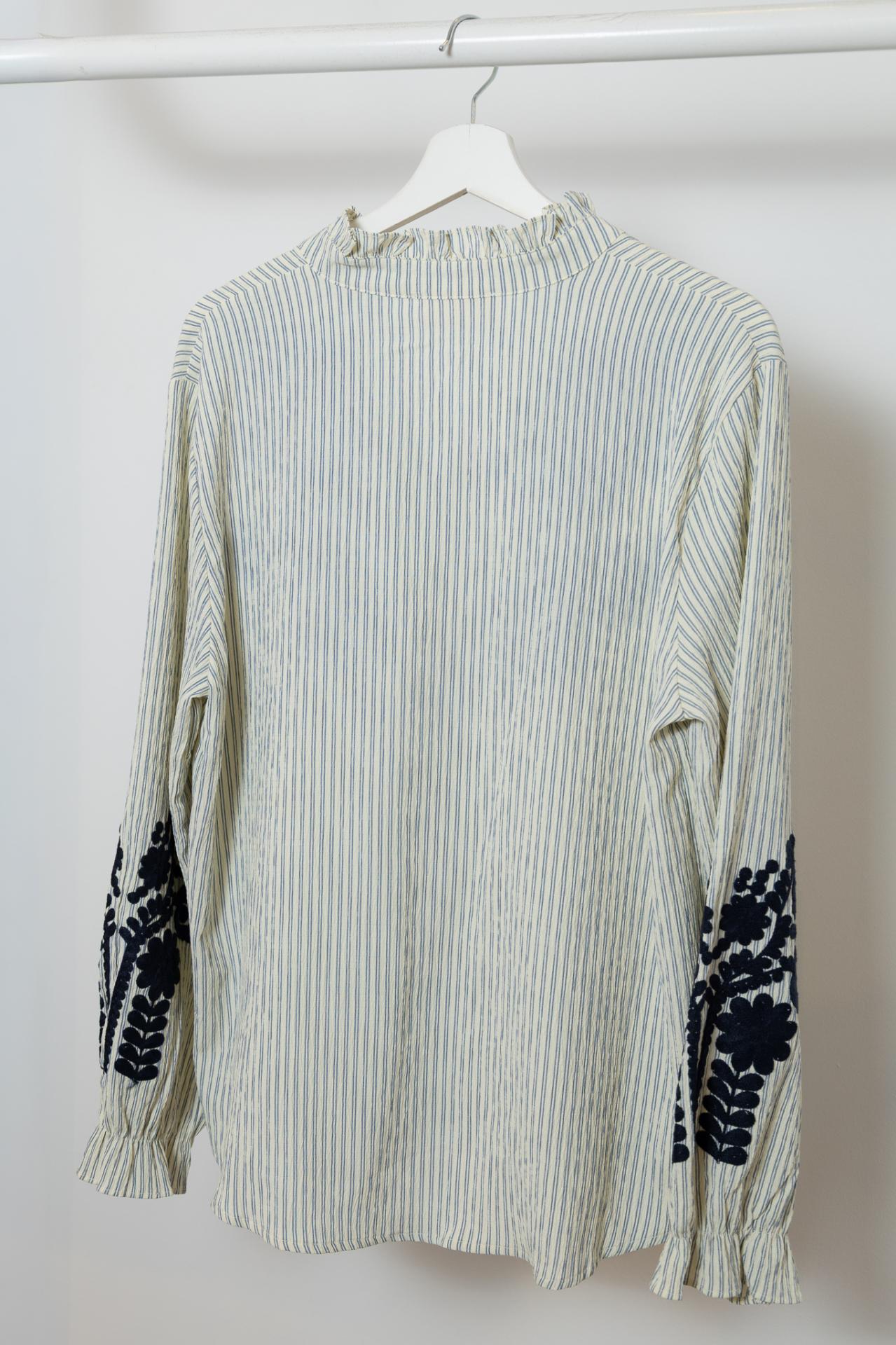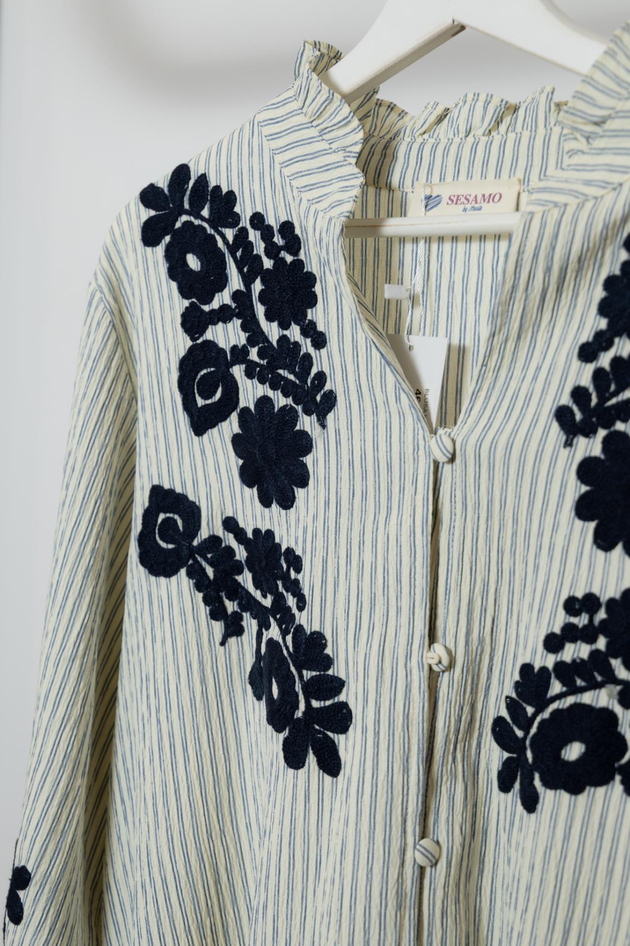 Blusa blanca con estampado de rayas finitas y bordados de flores en las mangas y en la parte alta del pecho. Con pequeños volantes en los puños y en el cuello.