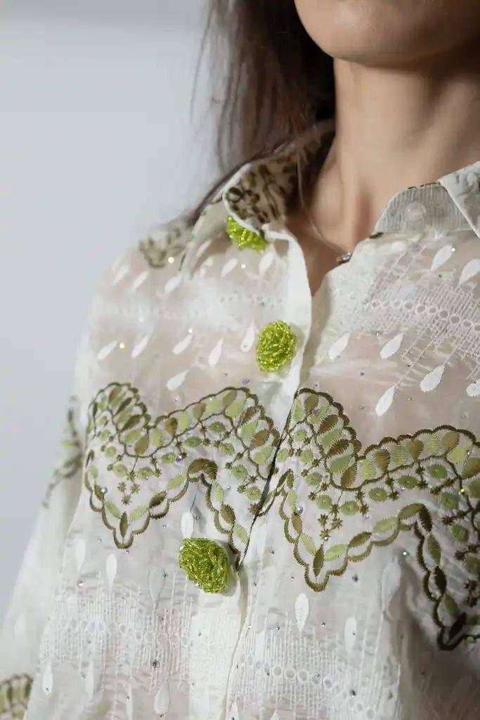 Camisa blanca, ligeramente anchita con bordados en tonos verdes, pequeños strass por toda la camisa y botones con joya en color verde.