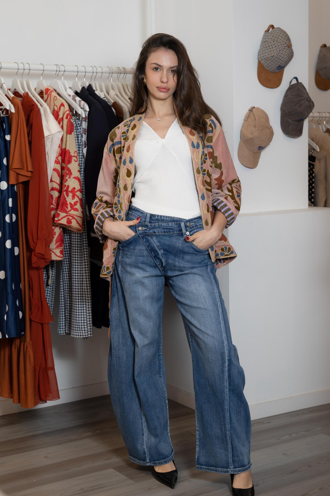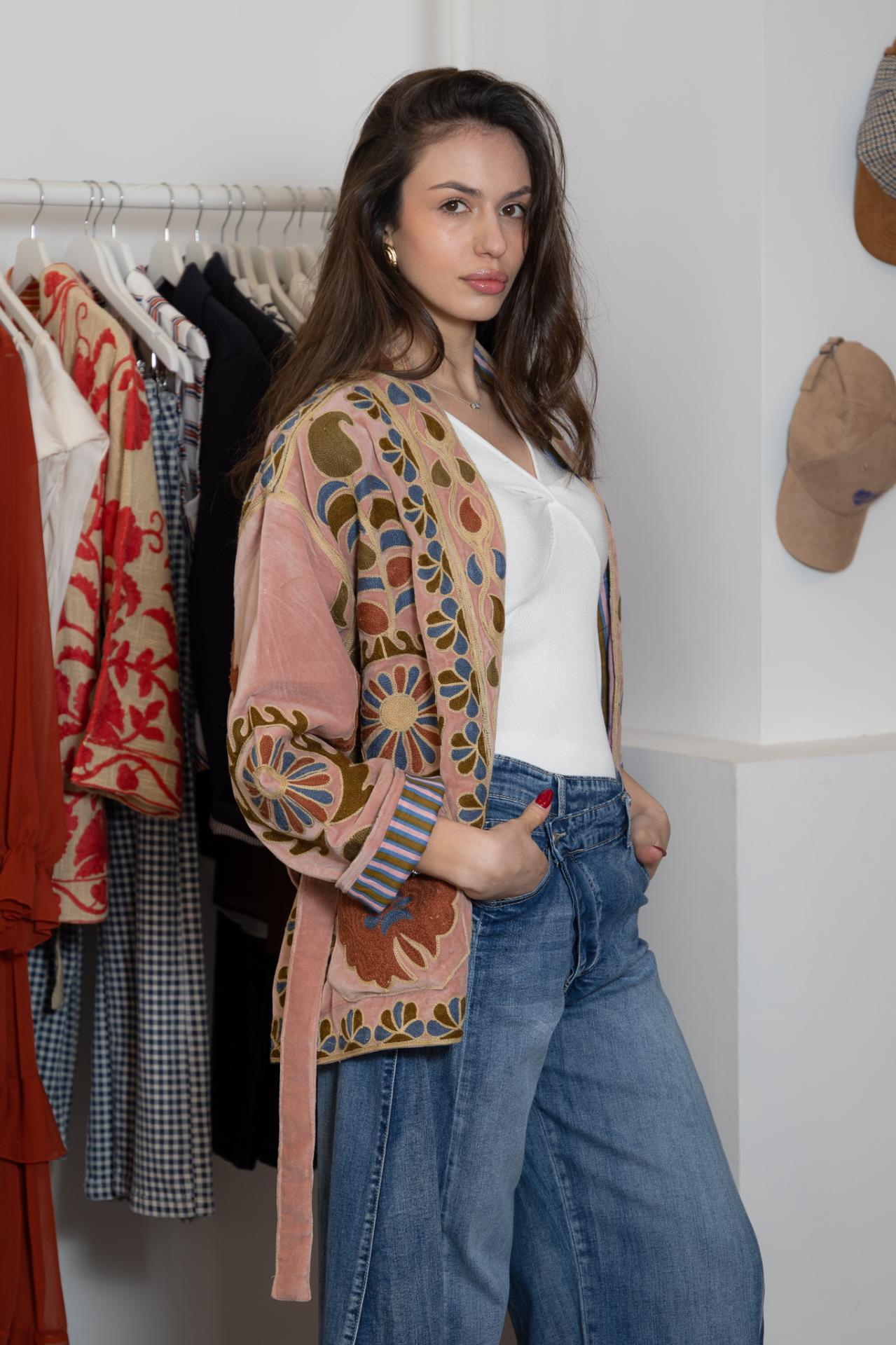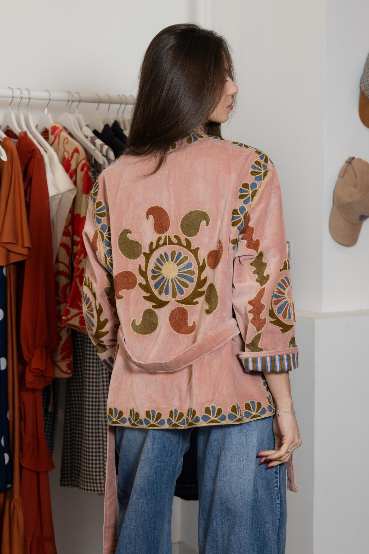 Chaqueta estilo kimono, en color rosa de terciopelo, con bordados bordados a mano en tonos tierra y azules, dos bolsillos cuadrados y cinturón a tono para atar.