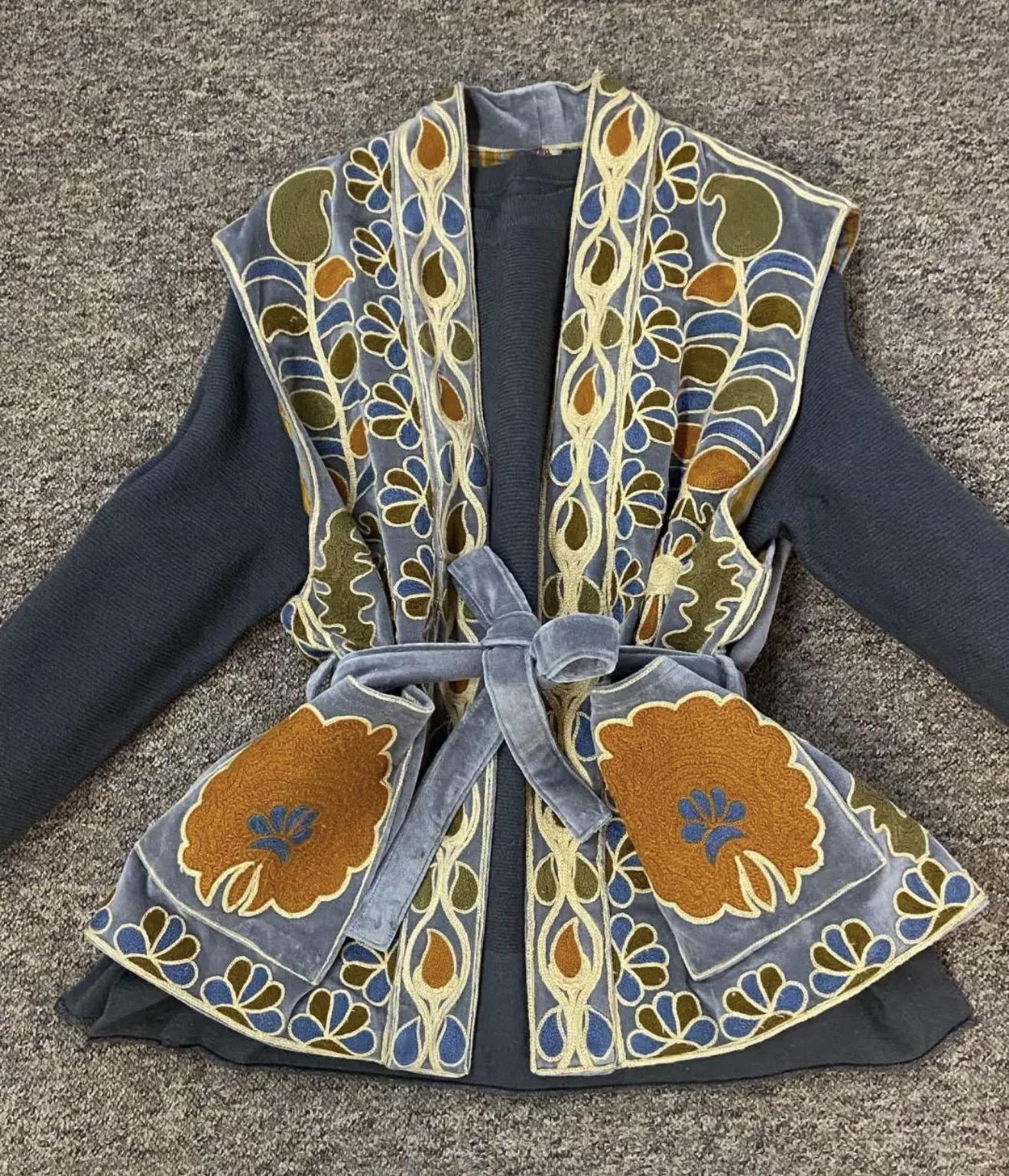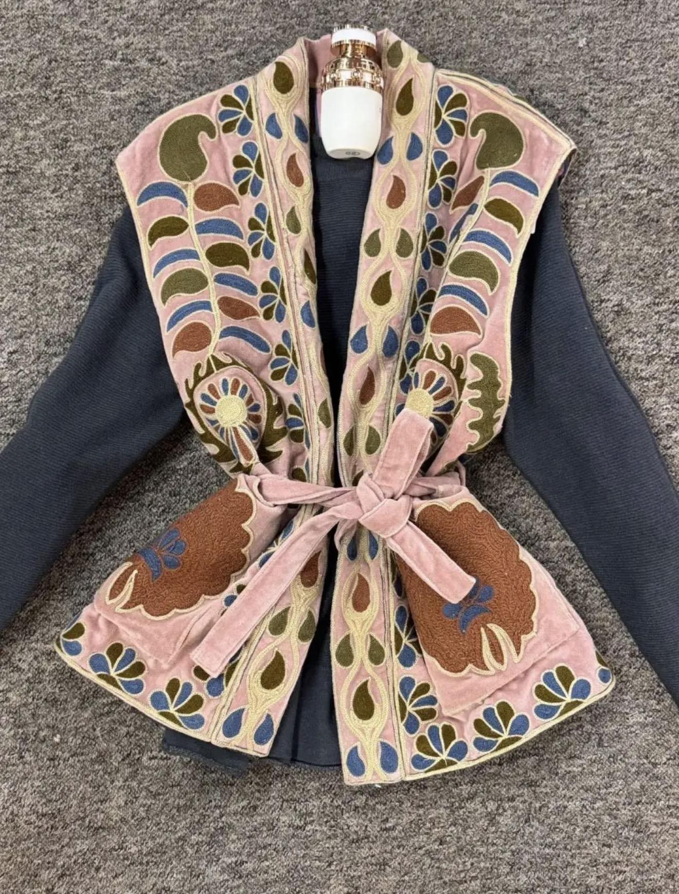 Original chaleco de terciopelo, en color rosa o azul, con bordados a mano en tonos tierra y azules, con bolsillos cuadrados y cinturón a tono para atar.
