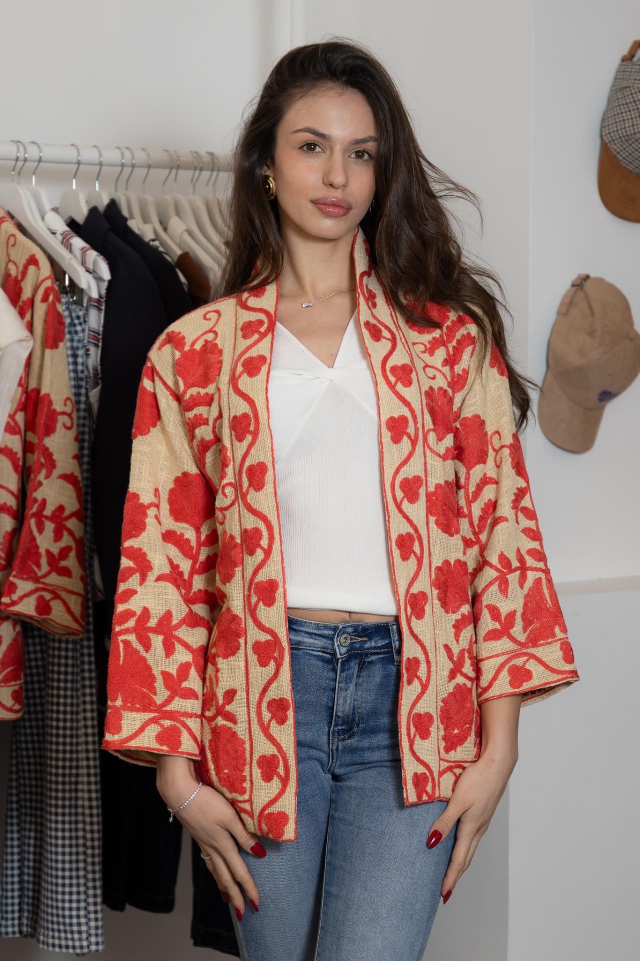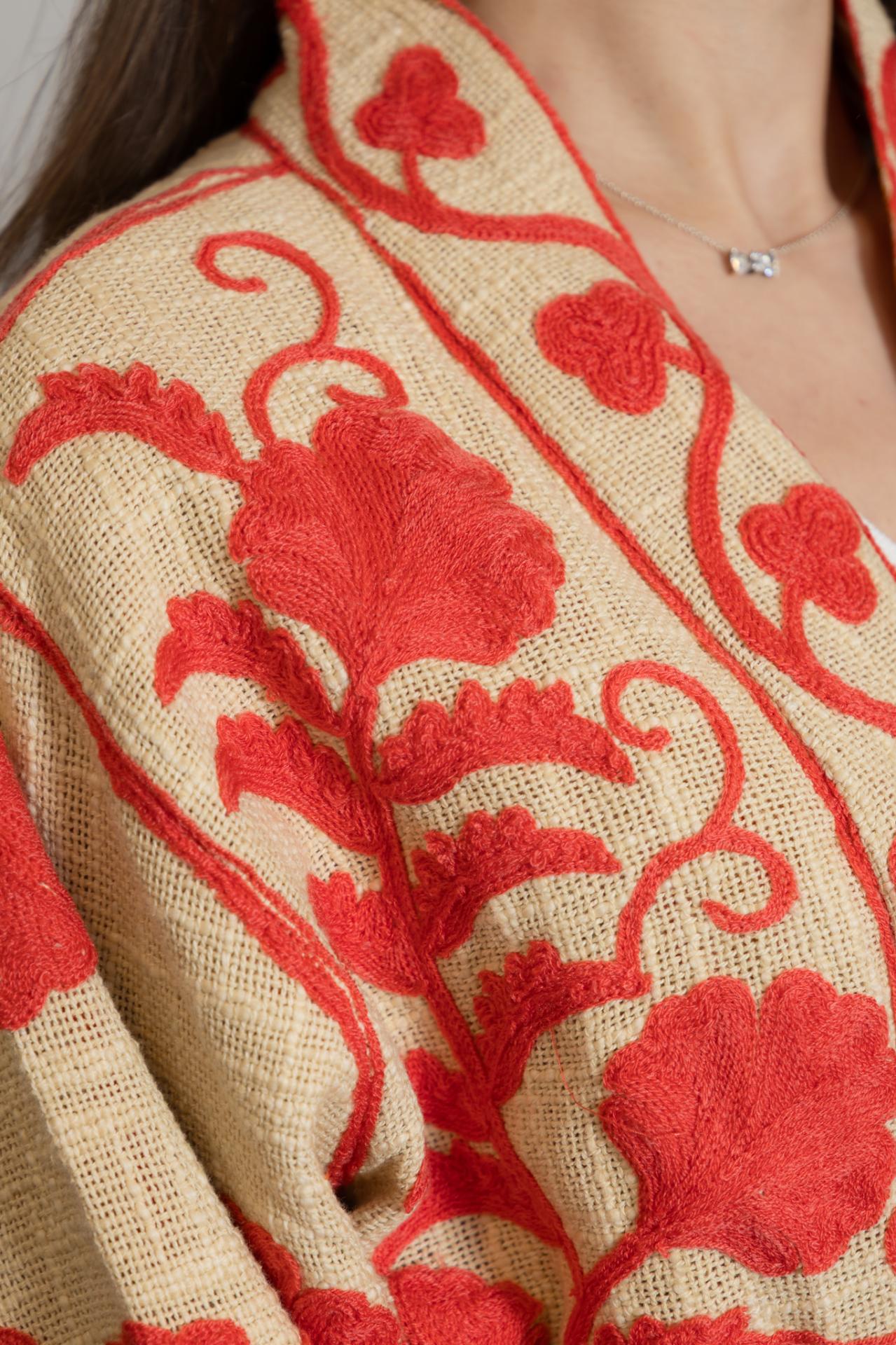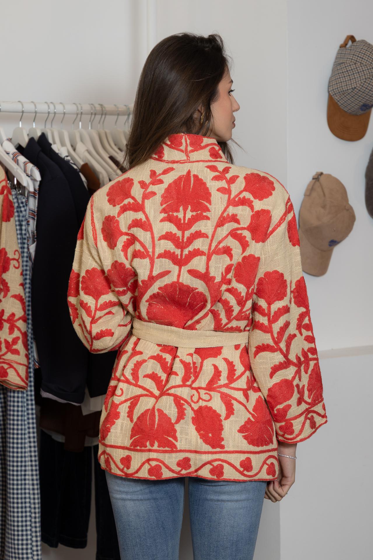 Chaqueta estilo kimono, con bordados a mano con técnica suzani, en color coral o azul. Tiene bolsillos en los laterales y cinturón a tono para atar.