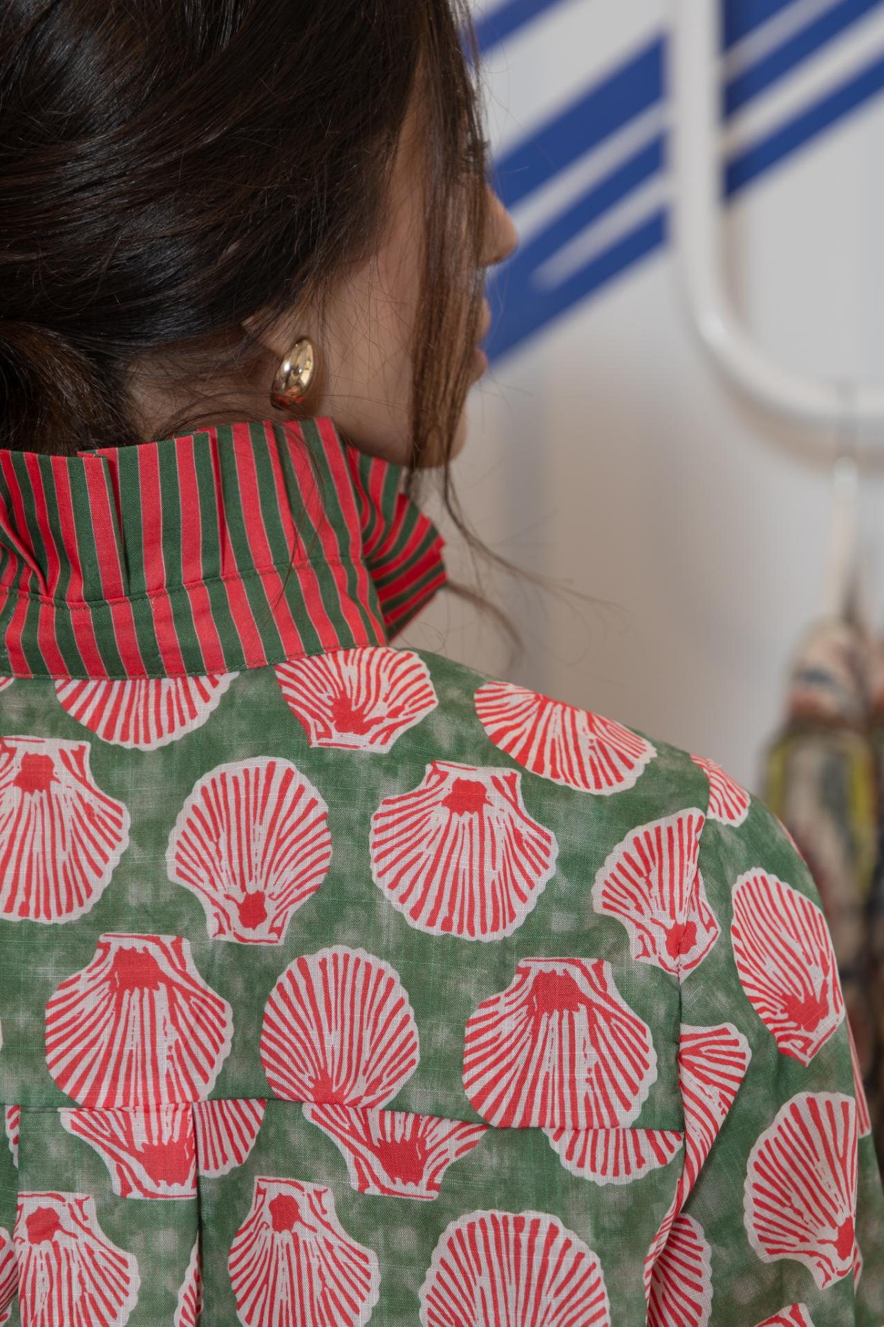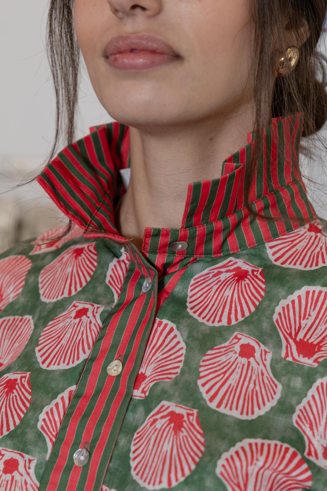 Camisa fluida, con estampado de conchas en color coral en fondo kakhi, cuello subido con volante y abotonada hasta la mitad.