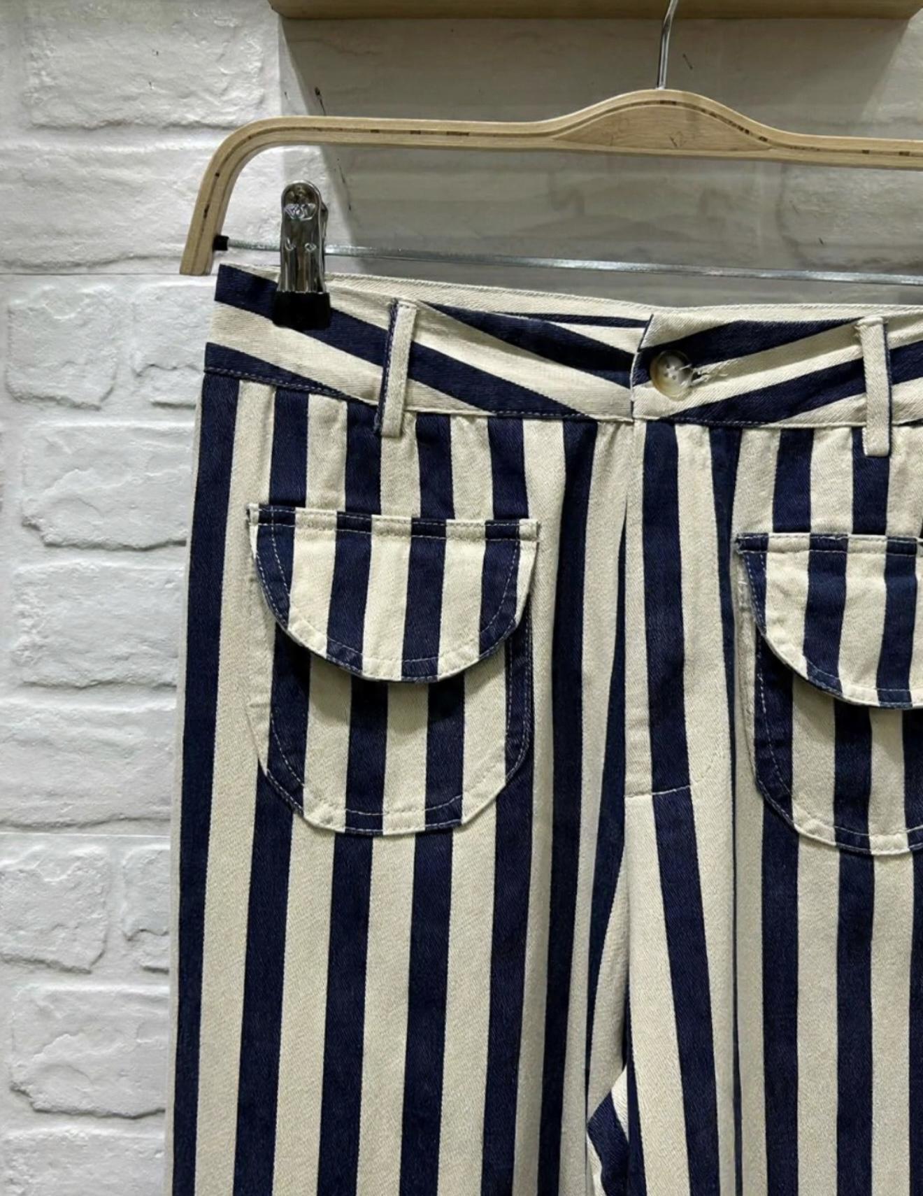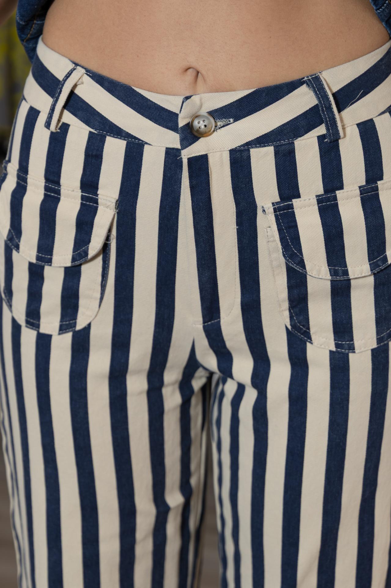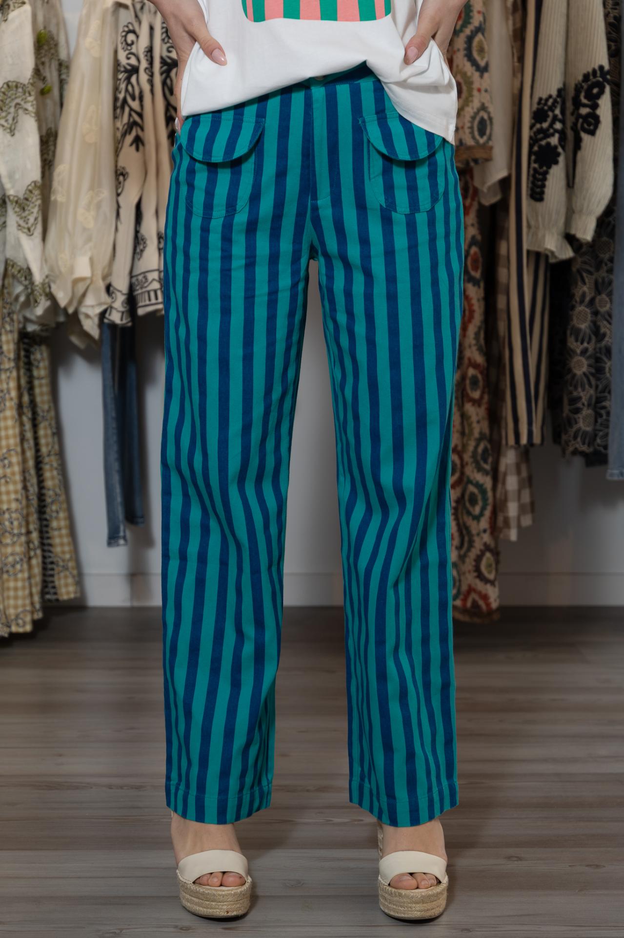 Pantalón de tejido ligero y de corte recto, estampado de rayas en varios colores y con bolsillos ovalados con solapas.