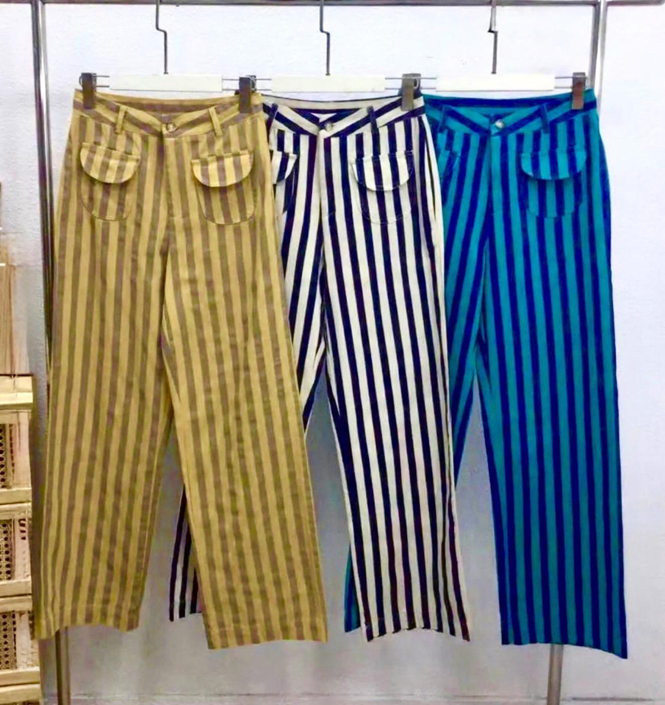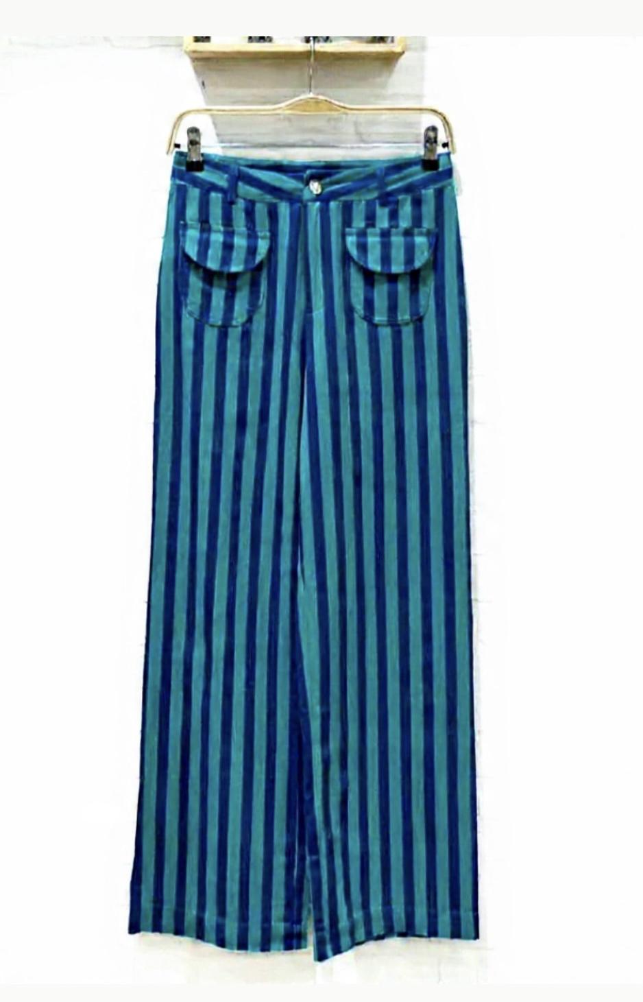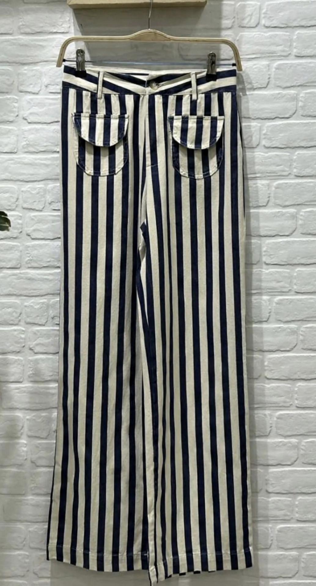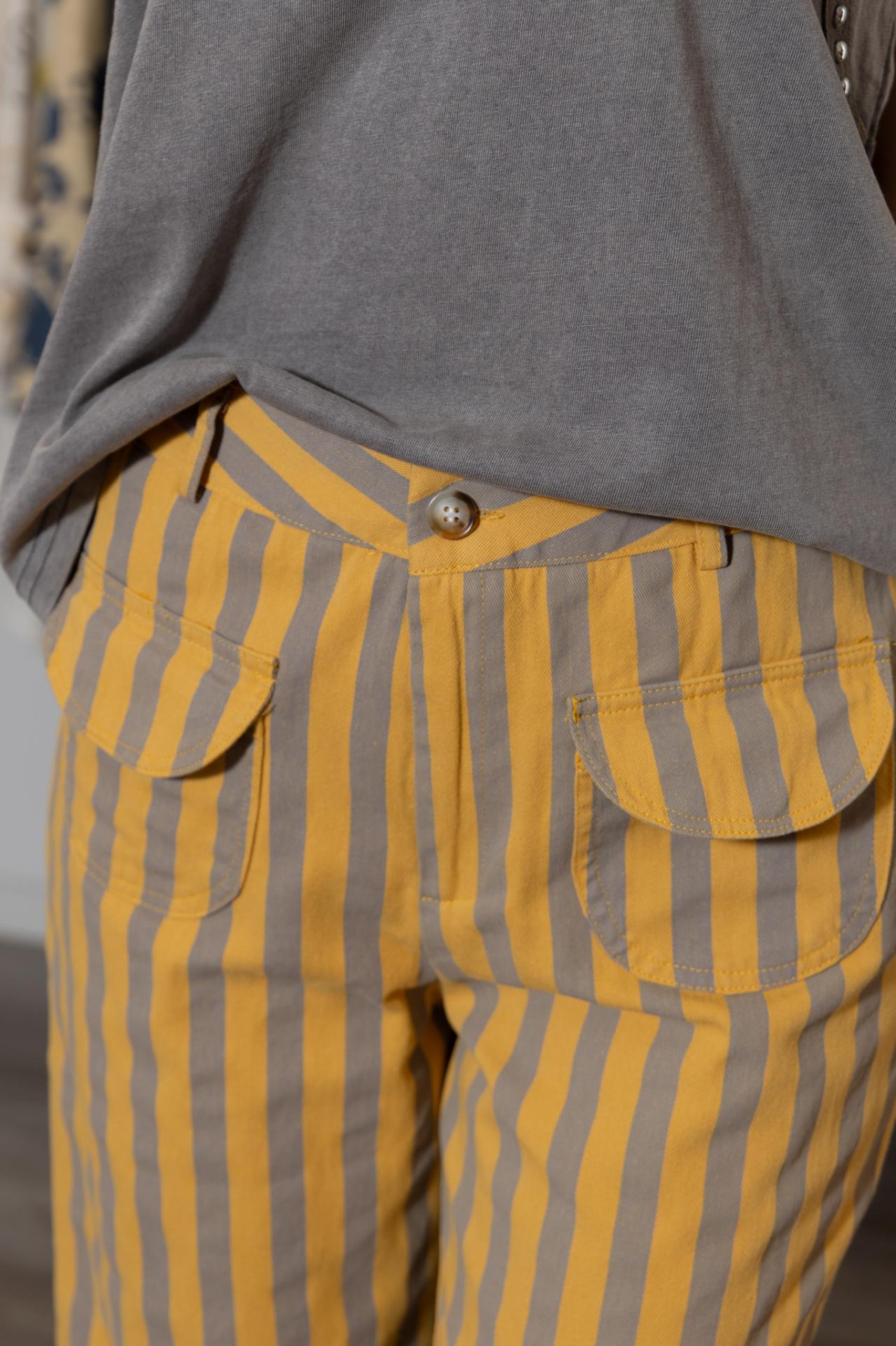 Pantalón de tejido ligero y de corte recto, estampado de rayas en varios colores y con bolsillos ovalados con solapas.