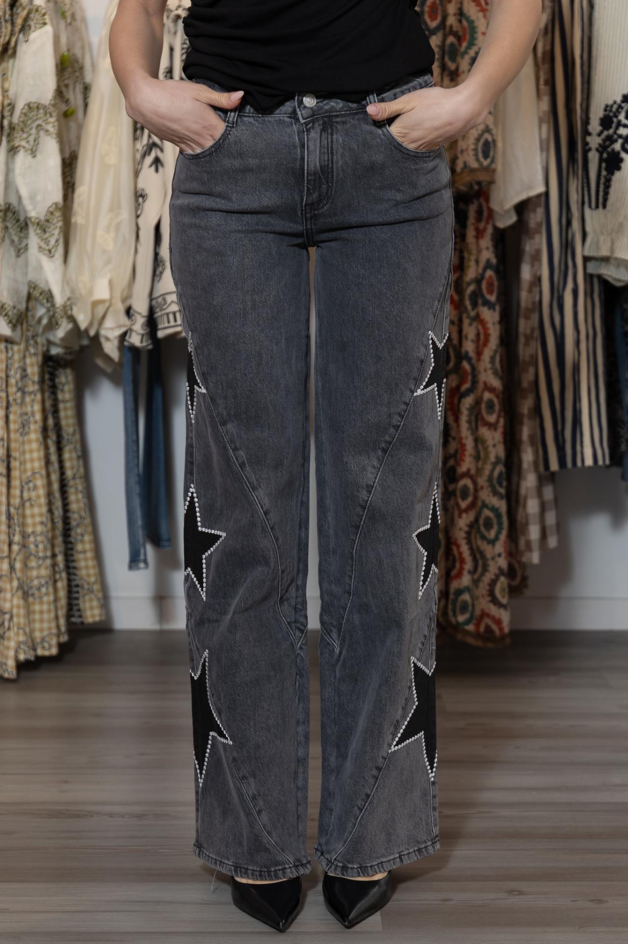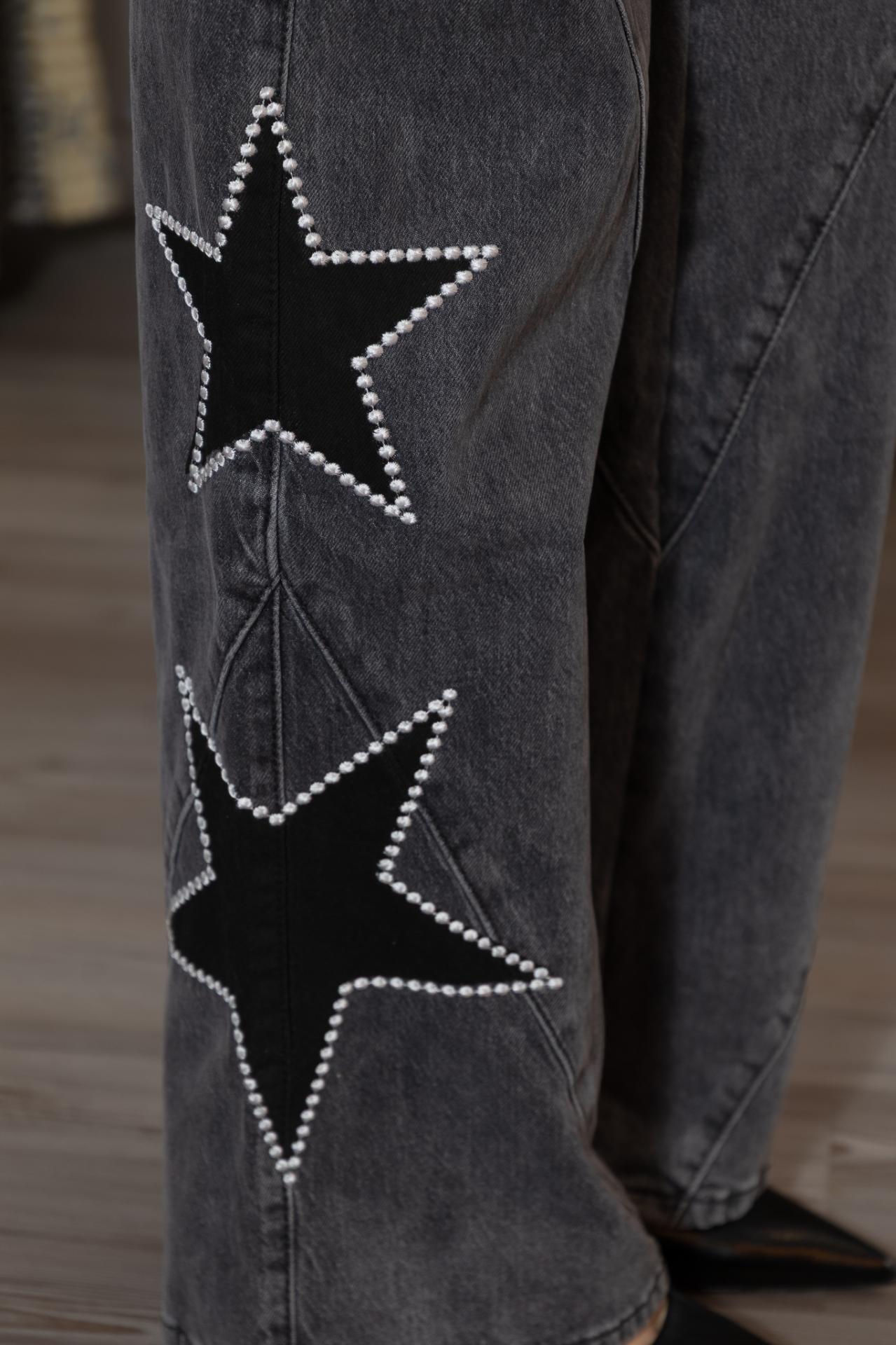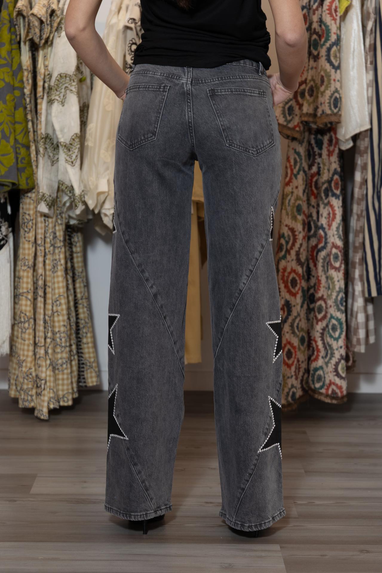 Pantalón denim en color gris desgastado, corte wide leg y con estrellas en negro y blanco en los laterales de ambas piernas.