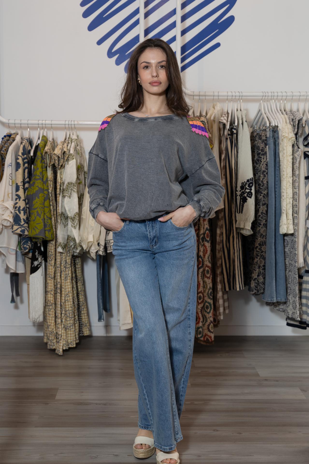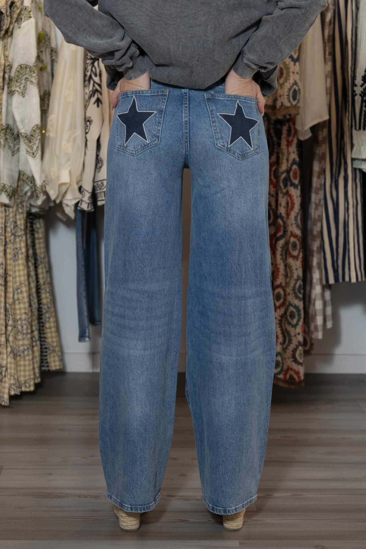 Denim de corte wide leg, con estrellas bordadas en los bolsillos traseros.