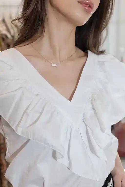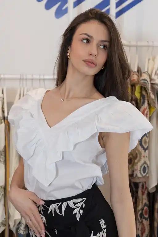 Blusa sin mangas en color blanco, con escote en V y volante por encima del pecho.