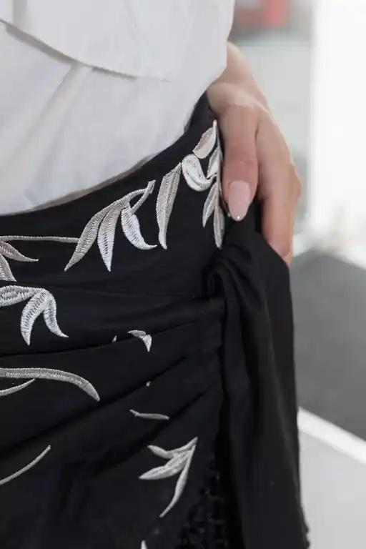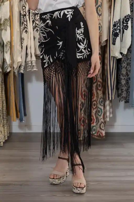 Falda pantalón corta con bordados y flecos, nudo en el lateral y cremallera en la parte trasera.