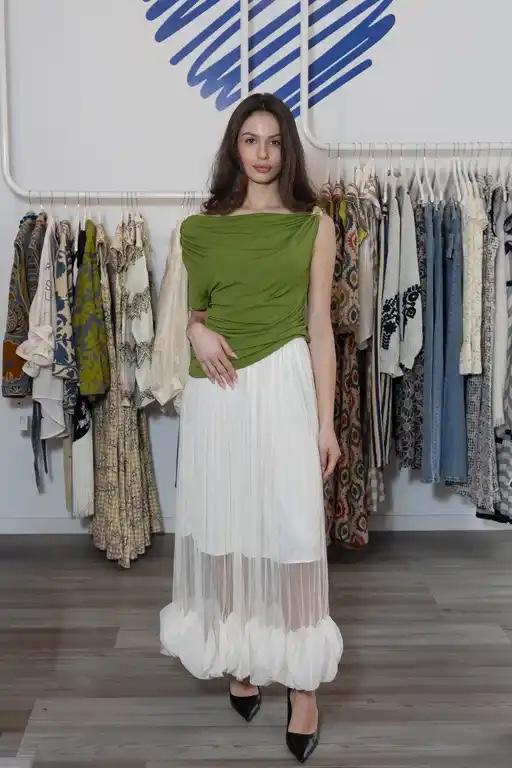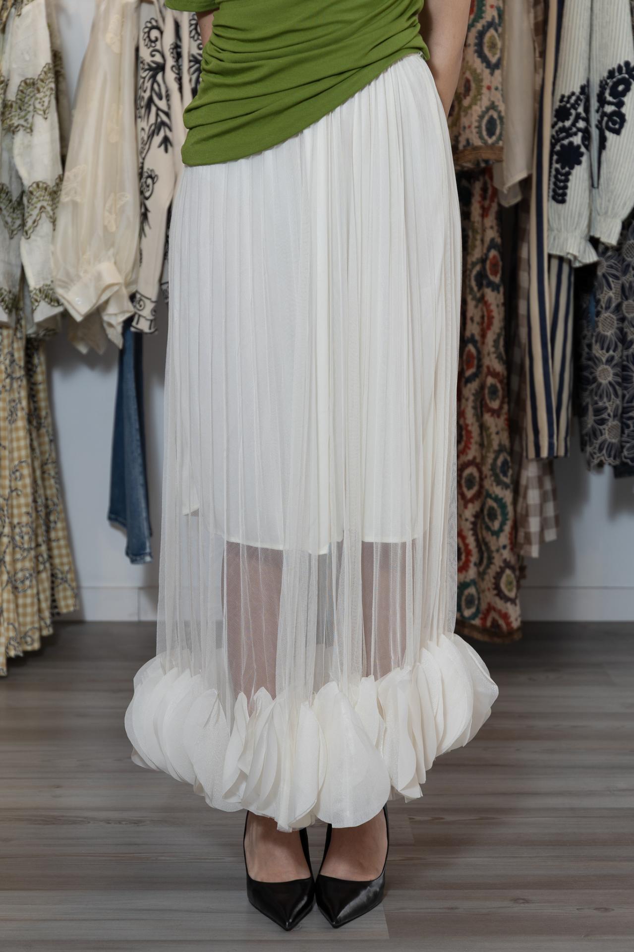 Original falda larga de gasa en color crudo, con pétalos cosidos en el bajo. Lleva forro y goma a la cintura.