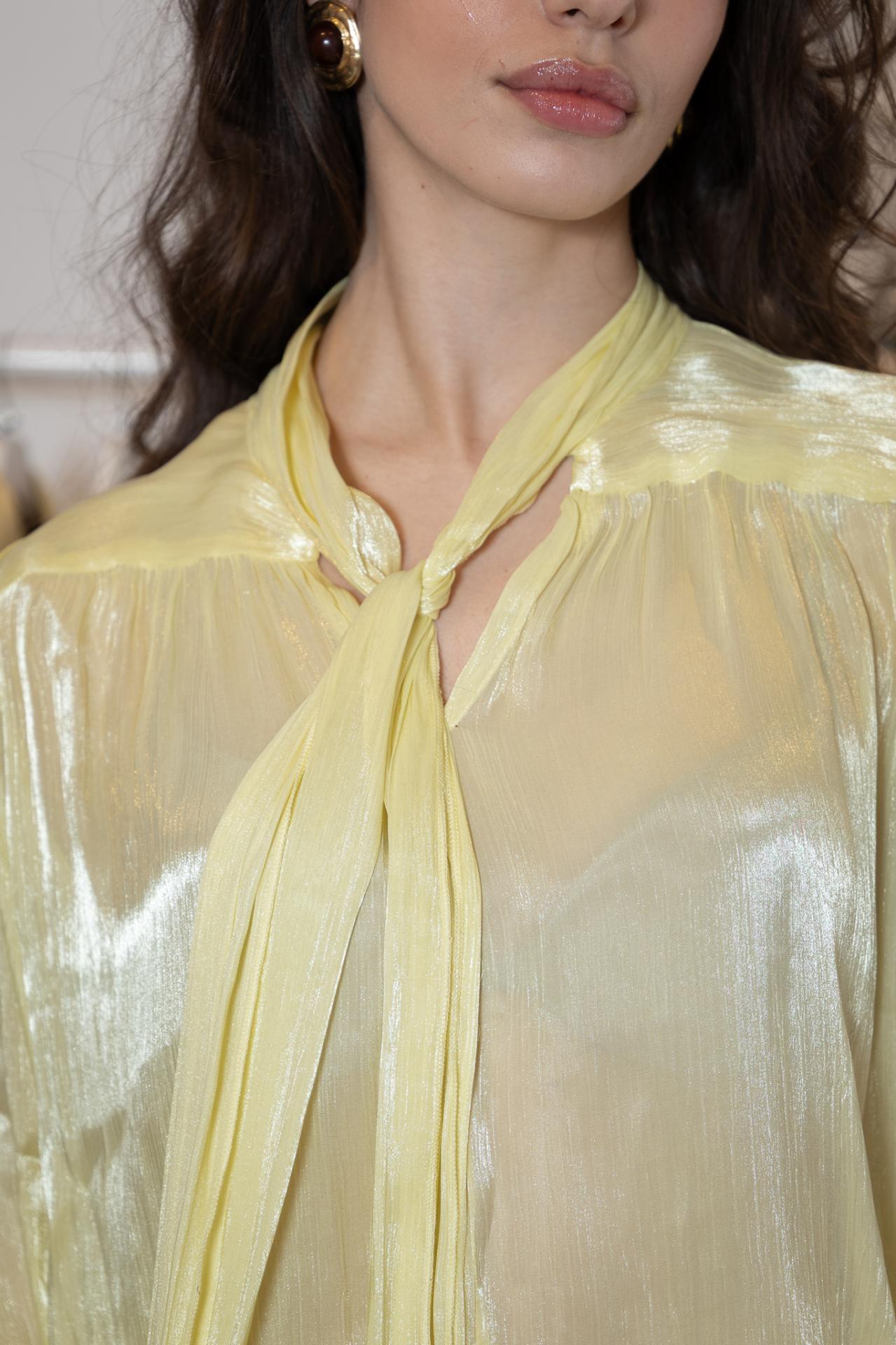 Conjunto de blusa y minifalda pantalón, de tejido fluido con un toque de brillo. La blusa de manga larga, con lazada para atar al cuello y gomita en los puños, y la falda con caida a capas y fruncida en los laterales de la cadera.