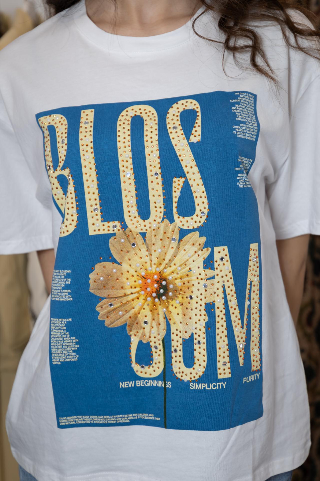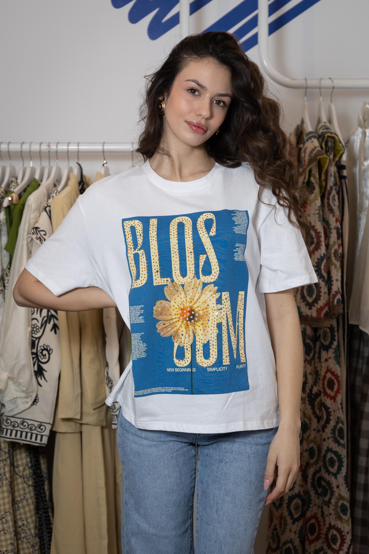 Camiseta de manga corta en blanco, con estampado "Blossom" en azul y amarillo y pequeños strass.