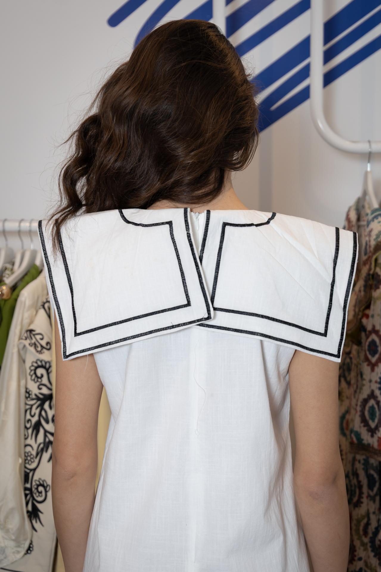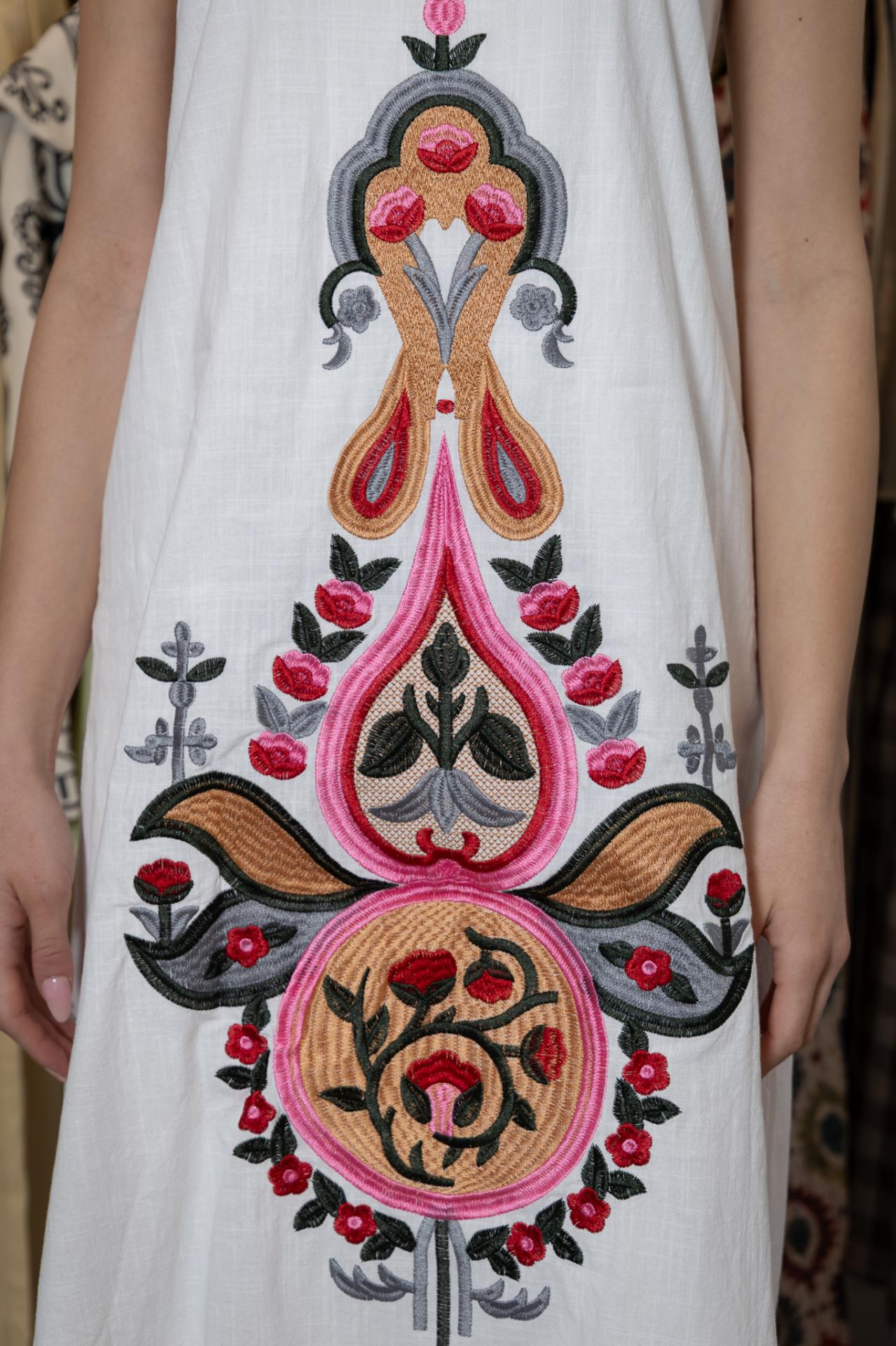 Vestido largo de hilo en color blanco y sin mangas. Con bordado super colorido en estilo floral y pequeñas solapas sobre los hombros con mismo bordado a juego. Va forrado.