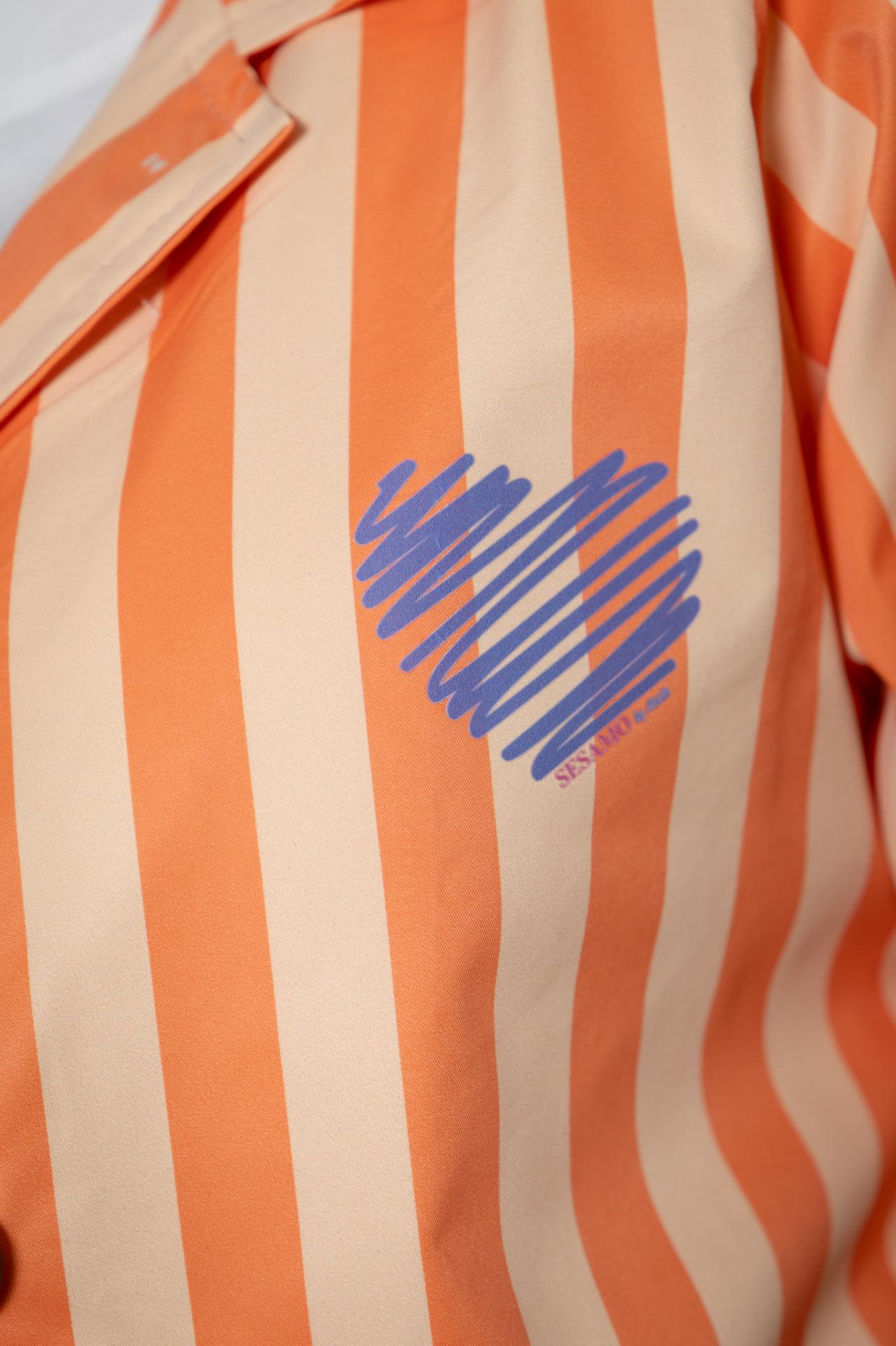 Nuestra original blazer de tejido impermeable y forrada, con diferentes estampados y en un lado el logo de sésamo. Tiene bolsillos.
