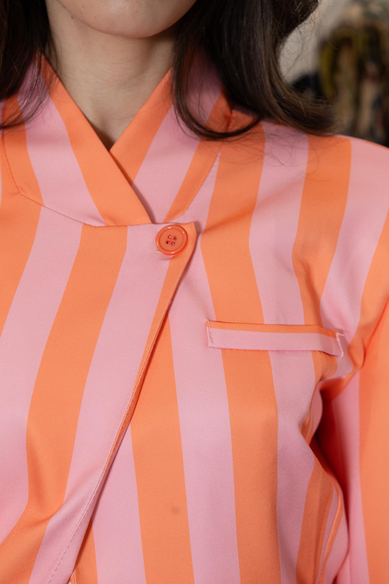 Original blazer a rayas en tono mandarina, de tejido suave ideal para el tiempo primaveral y se cierra con un único botón al cuello dejándola abierta por la parte de abajo. Tiene bolsillos.