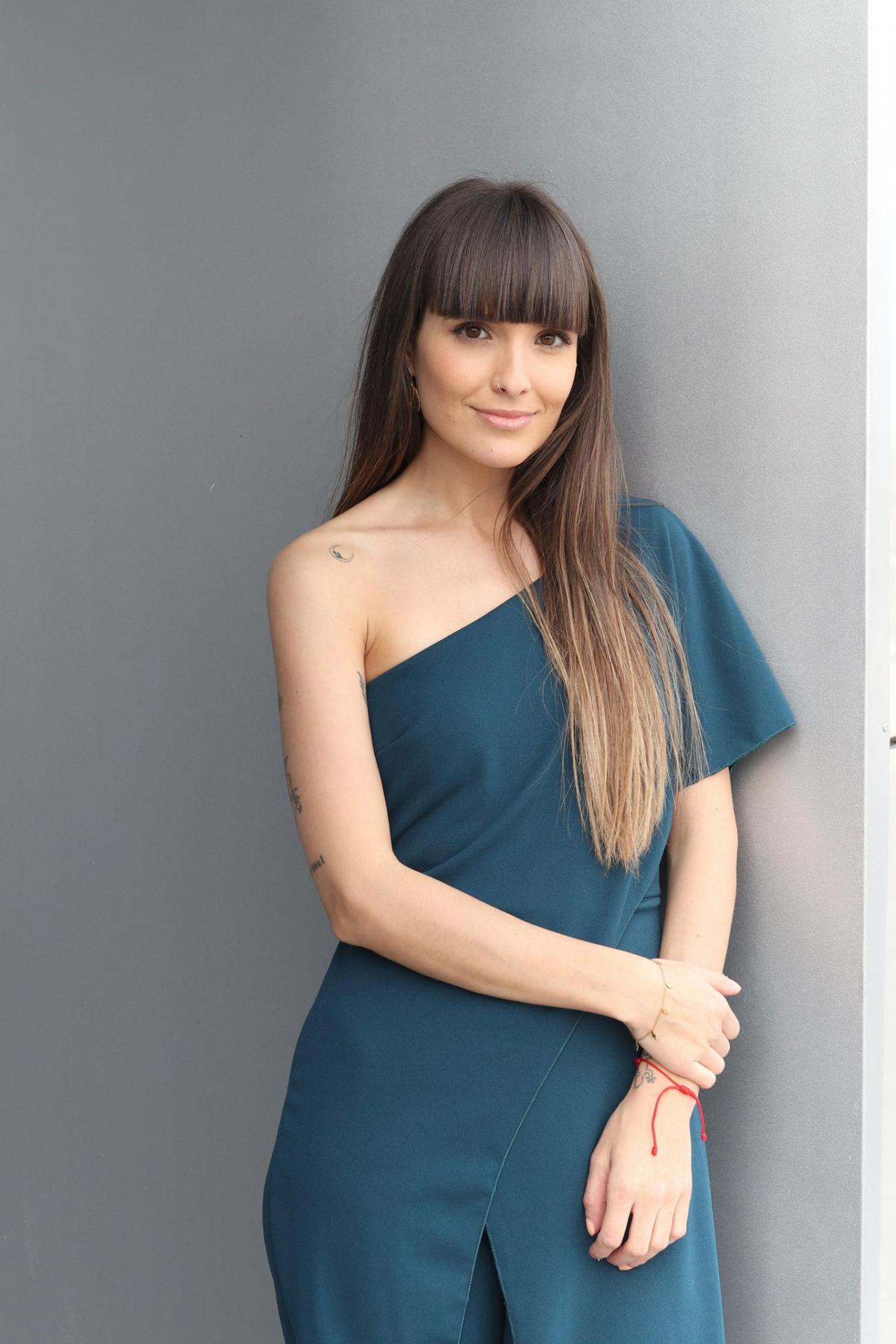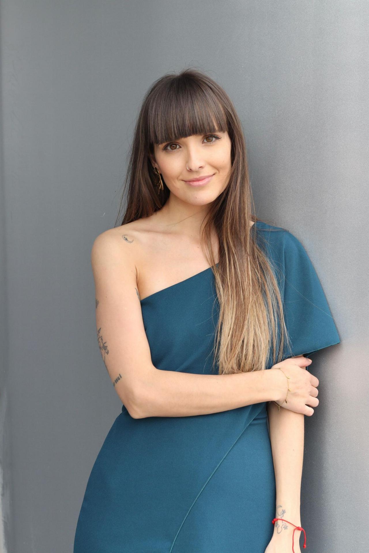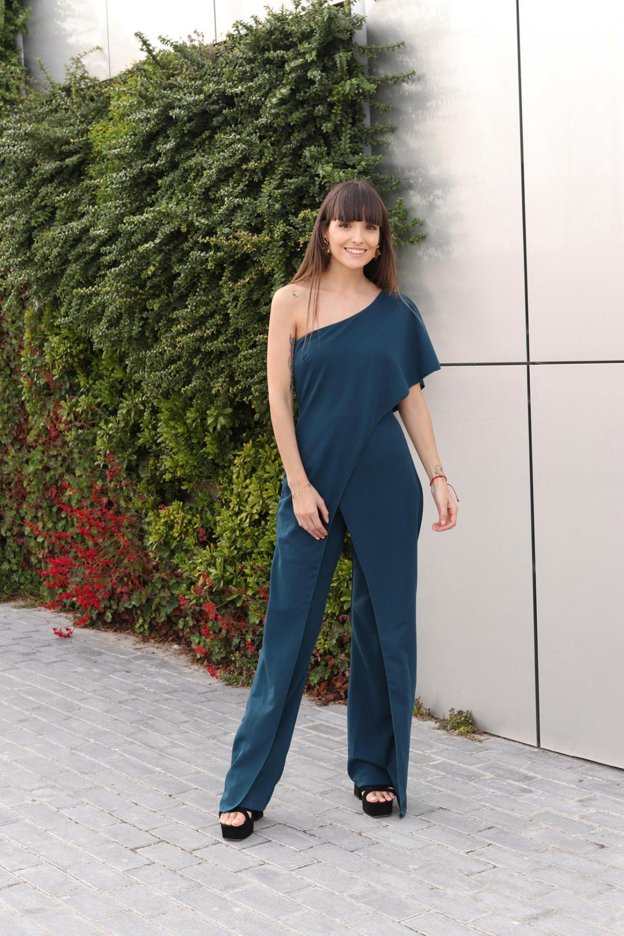 Mono largo tejido crepe, asimétrico de una manga con capa en la parte delantera, cremallera trasera.