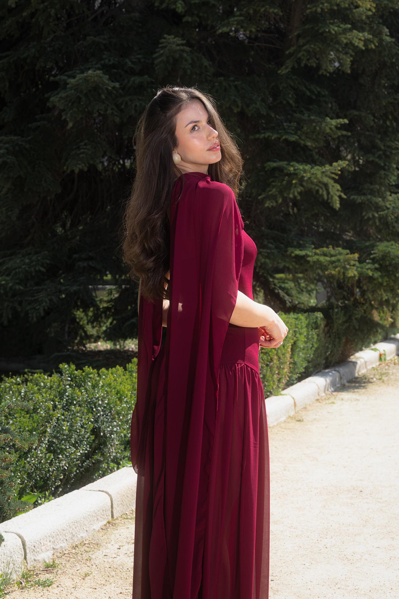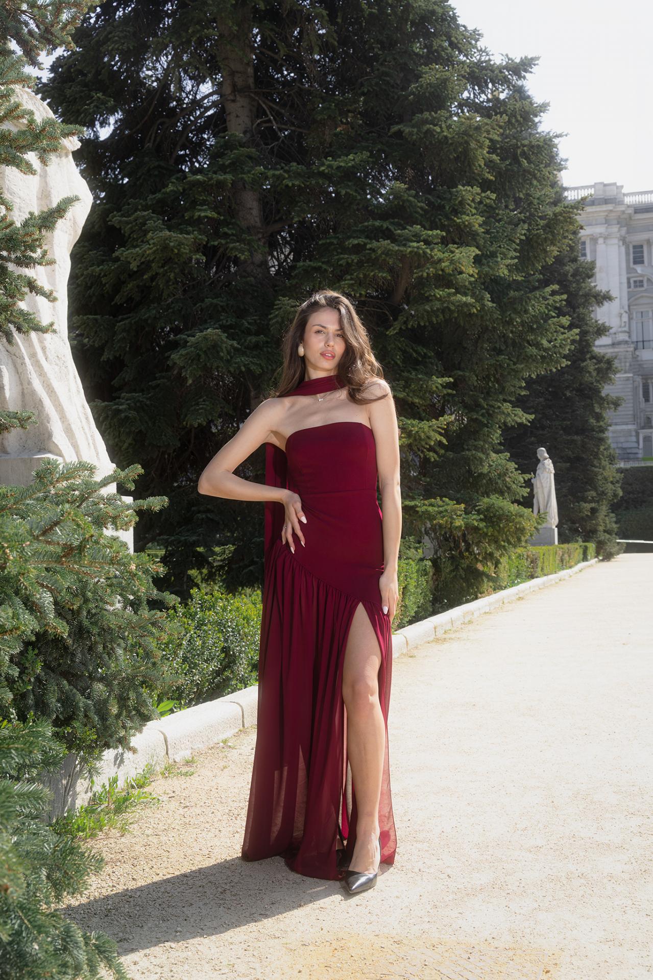 Vestido largo ideal para cualquier evento. Escote palabra de honor, de tejido crepe hasta la cadera desde la que cae falda de gasa con abertura. Pecho con preformado y foular para el cuello a tono.