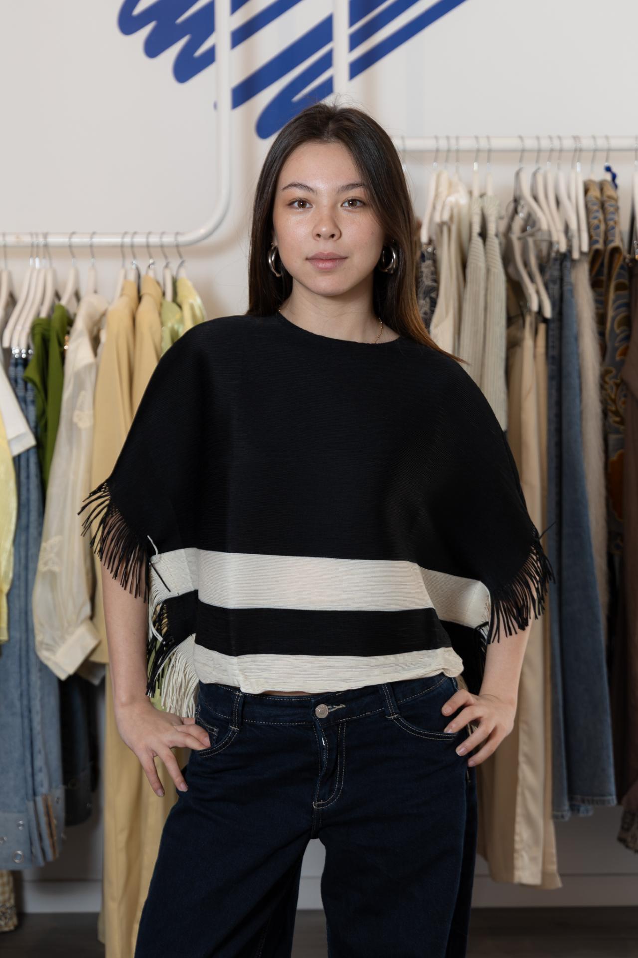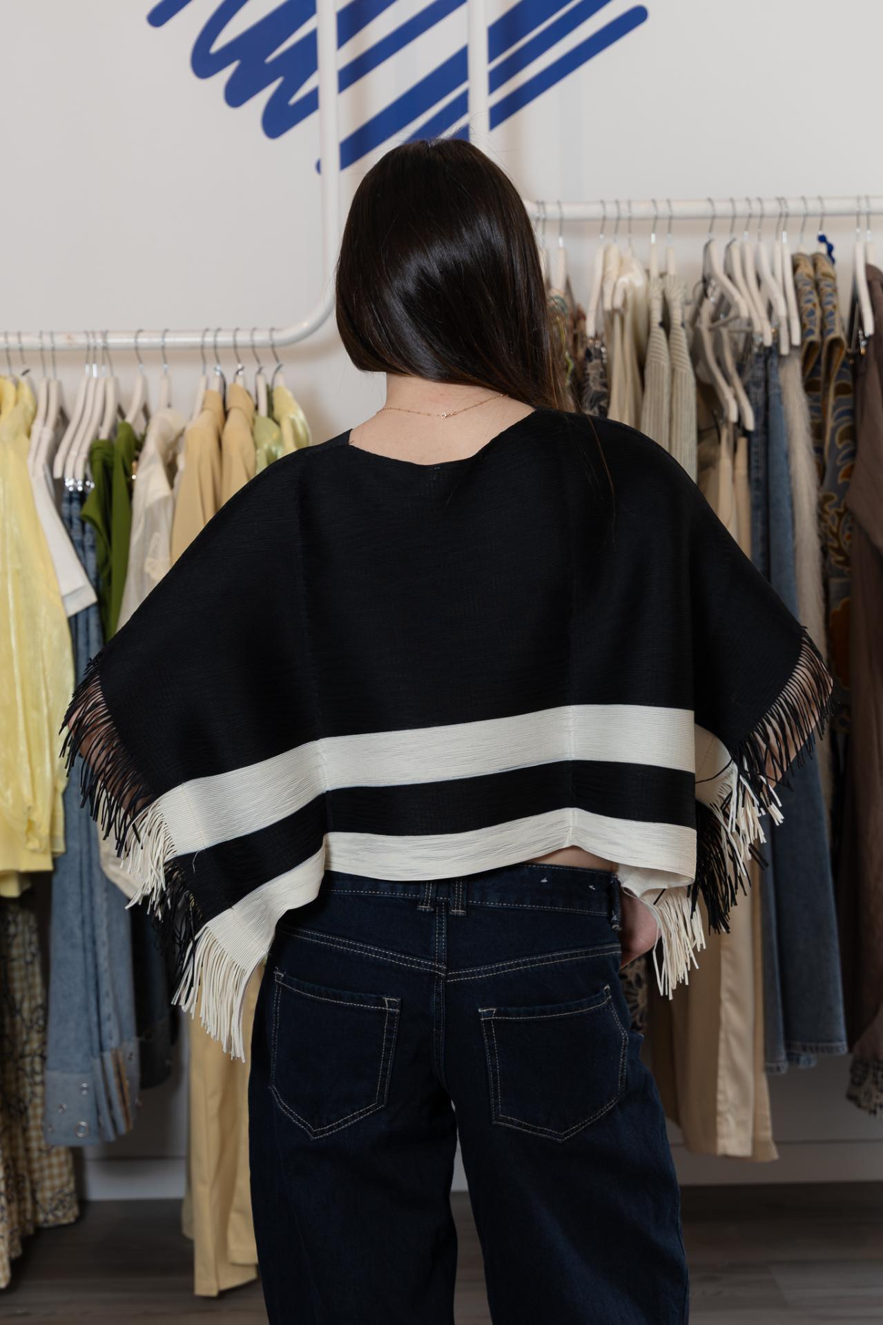 Original blusa cortita de plisado miyake, en color negro y blanco, con pequeños flecos en las mangas. Buena opción también para usarlo como capita encima de los hombros en nuestros looks para evento.