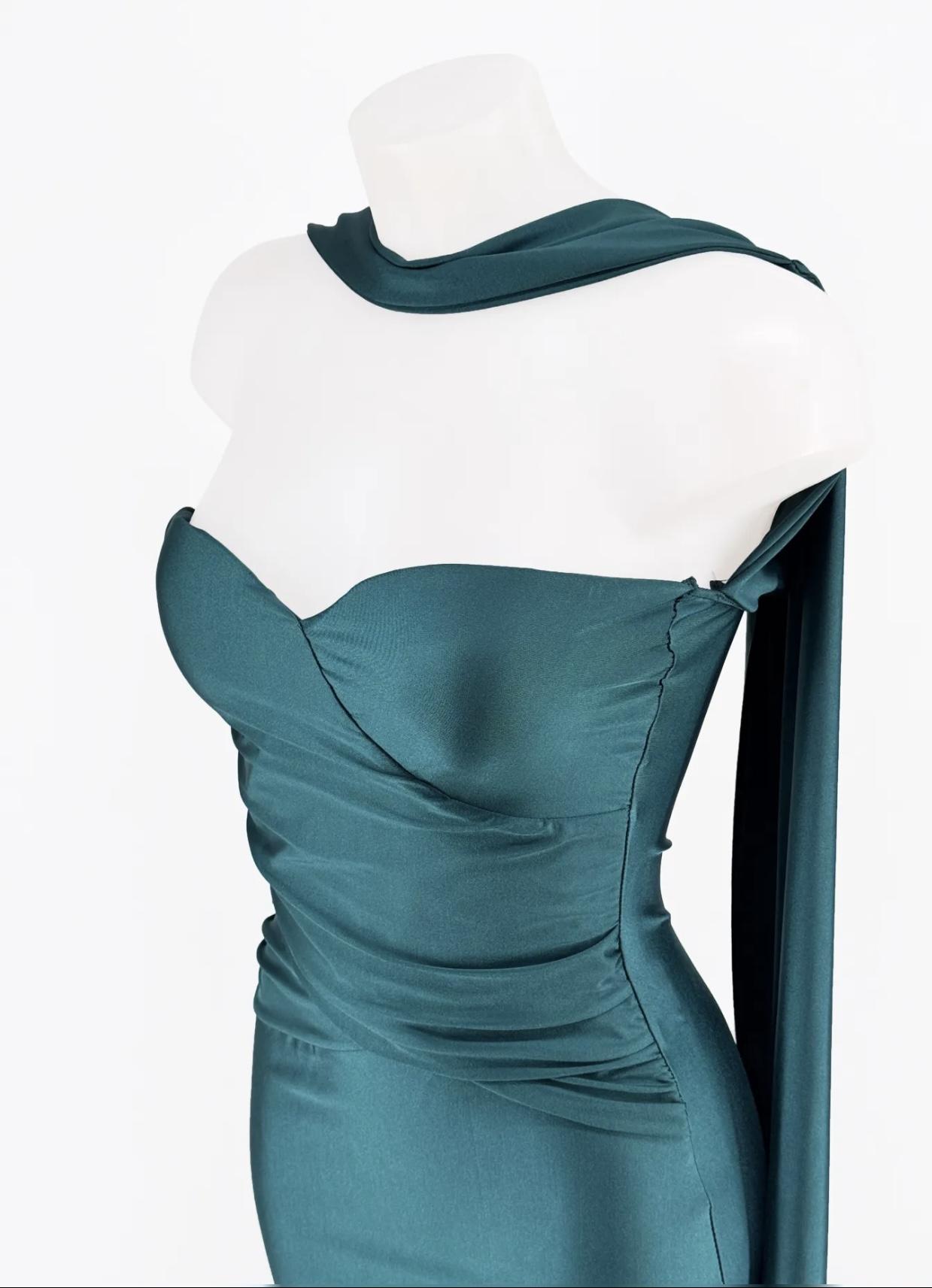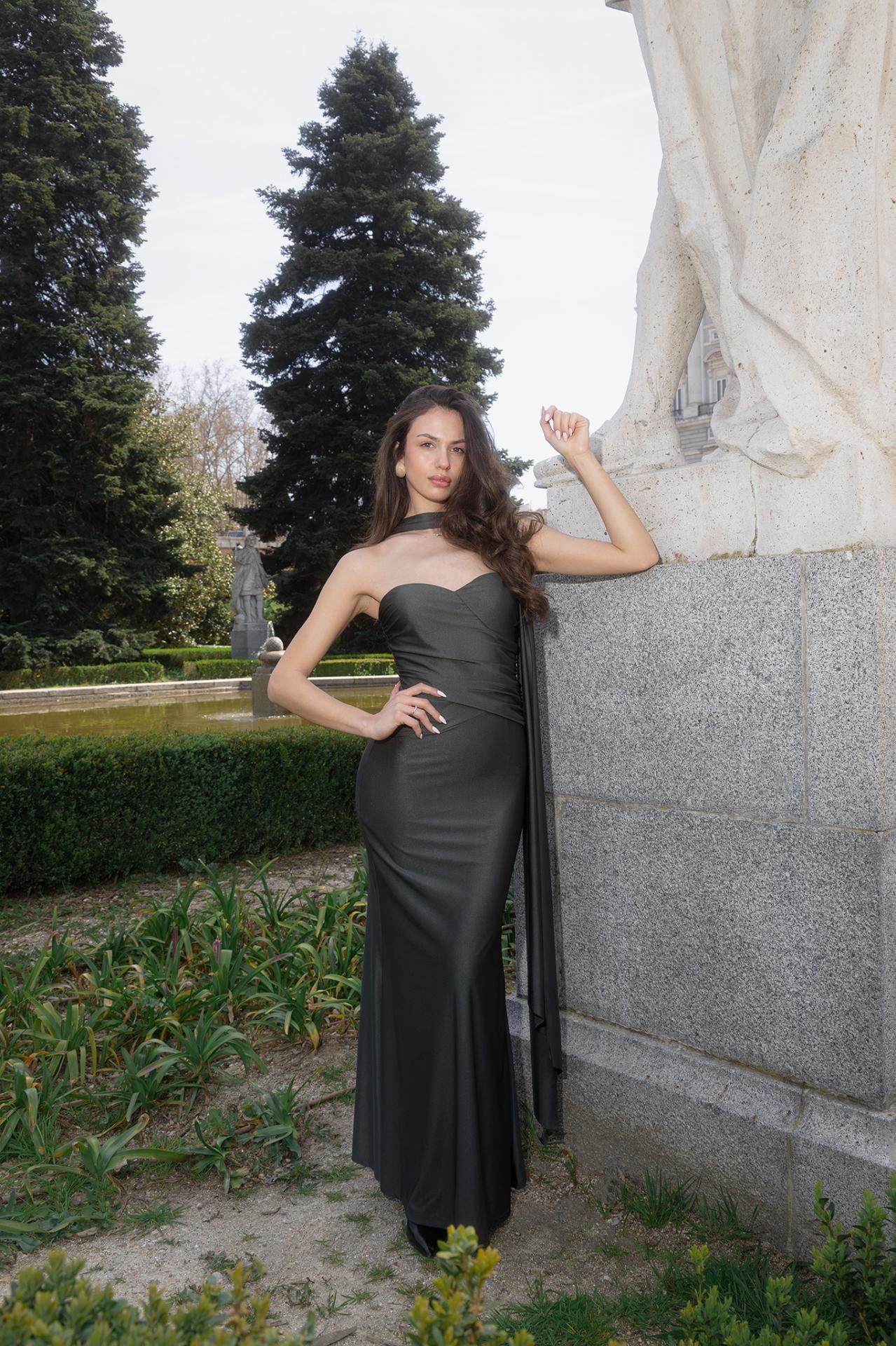 Vestido largo satinado con pieza fruncida q cruza el pecho. Banda para pasar por el cuello y espalda libre con dos elegantes bandas que cuelgan.