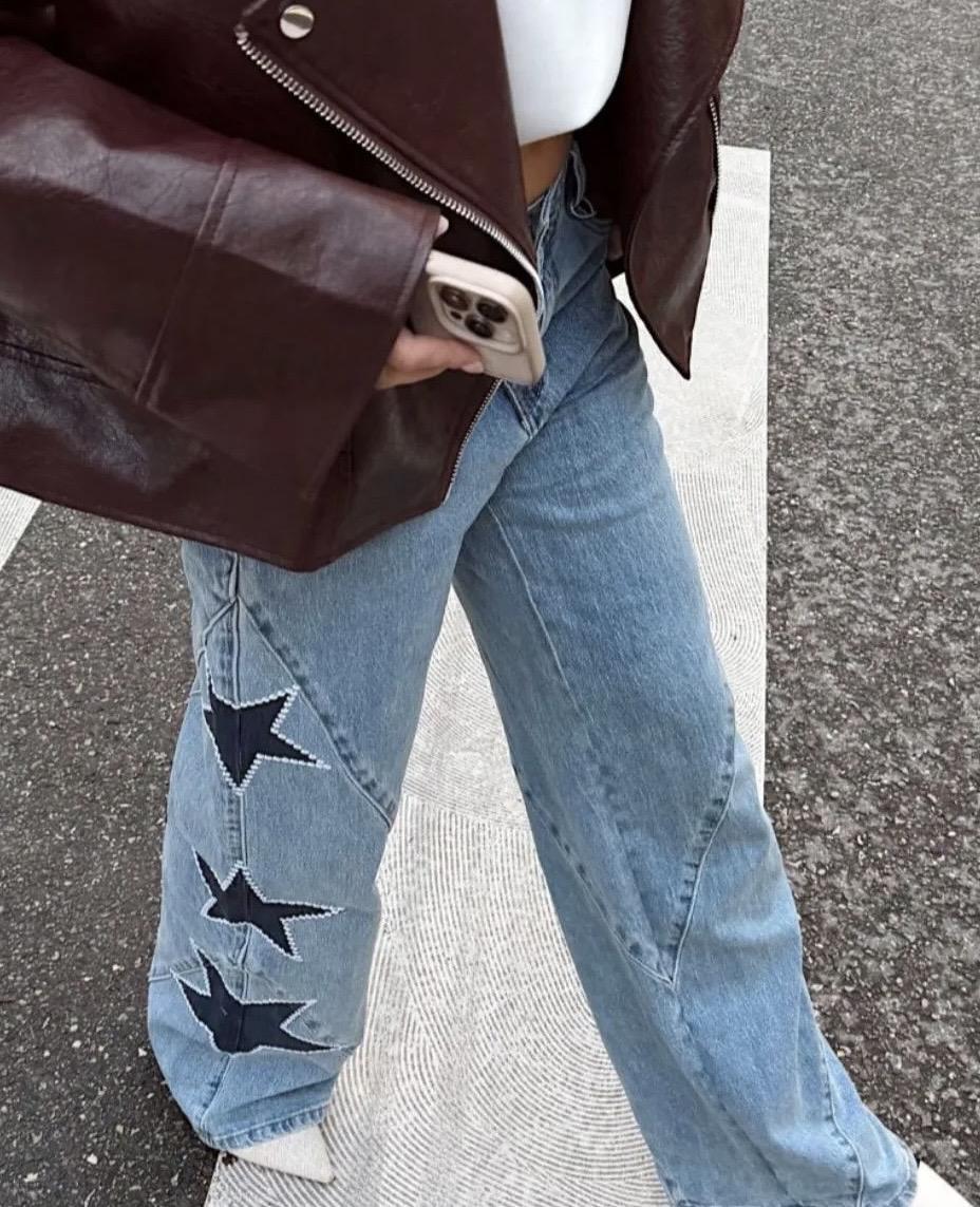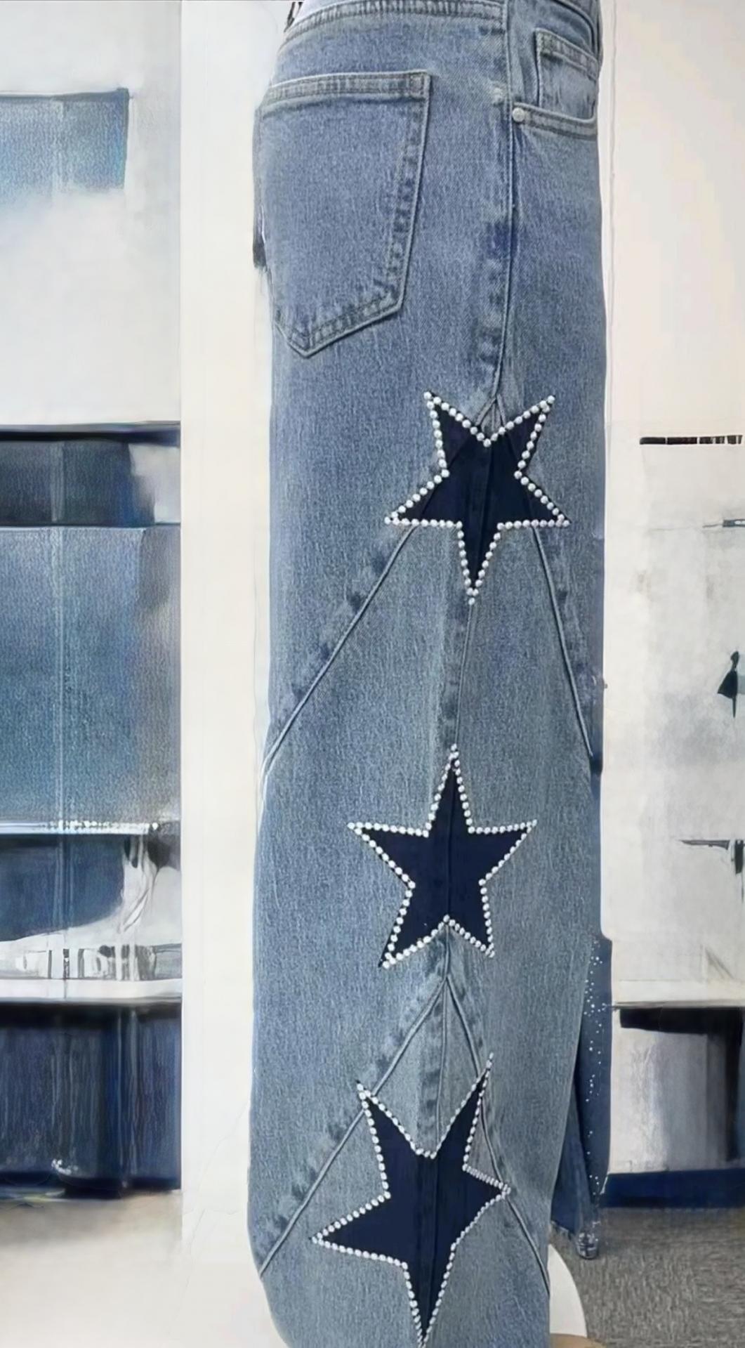 Pantalón denim azul, corte wide leg y con estrellas en azul oscuro y blanco en los laterales de ambas piernas.
