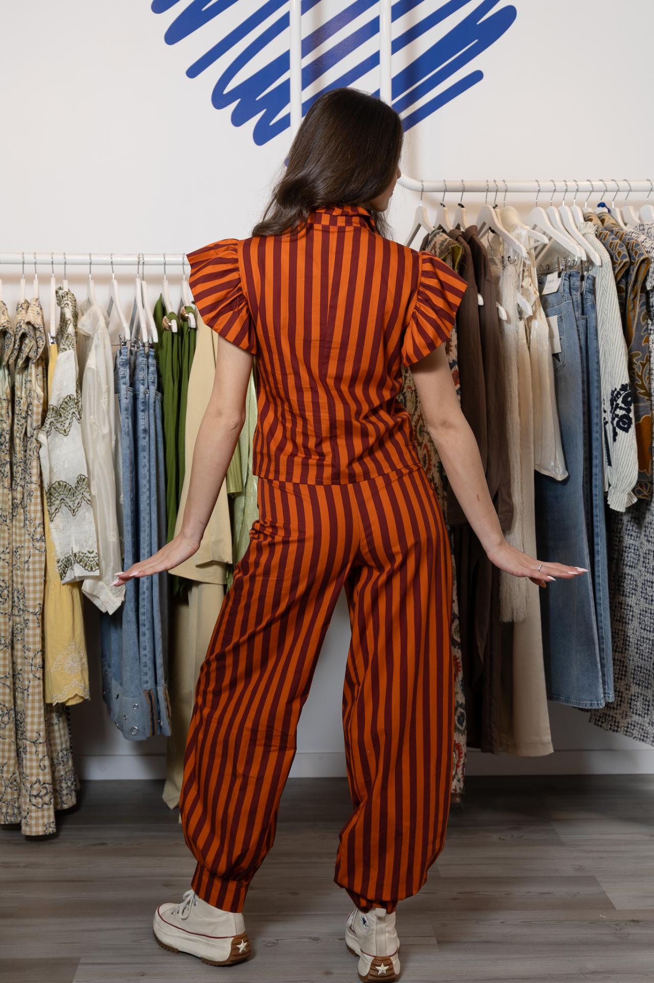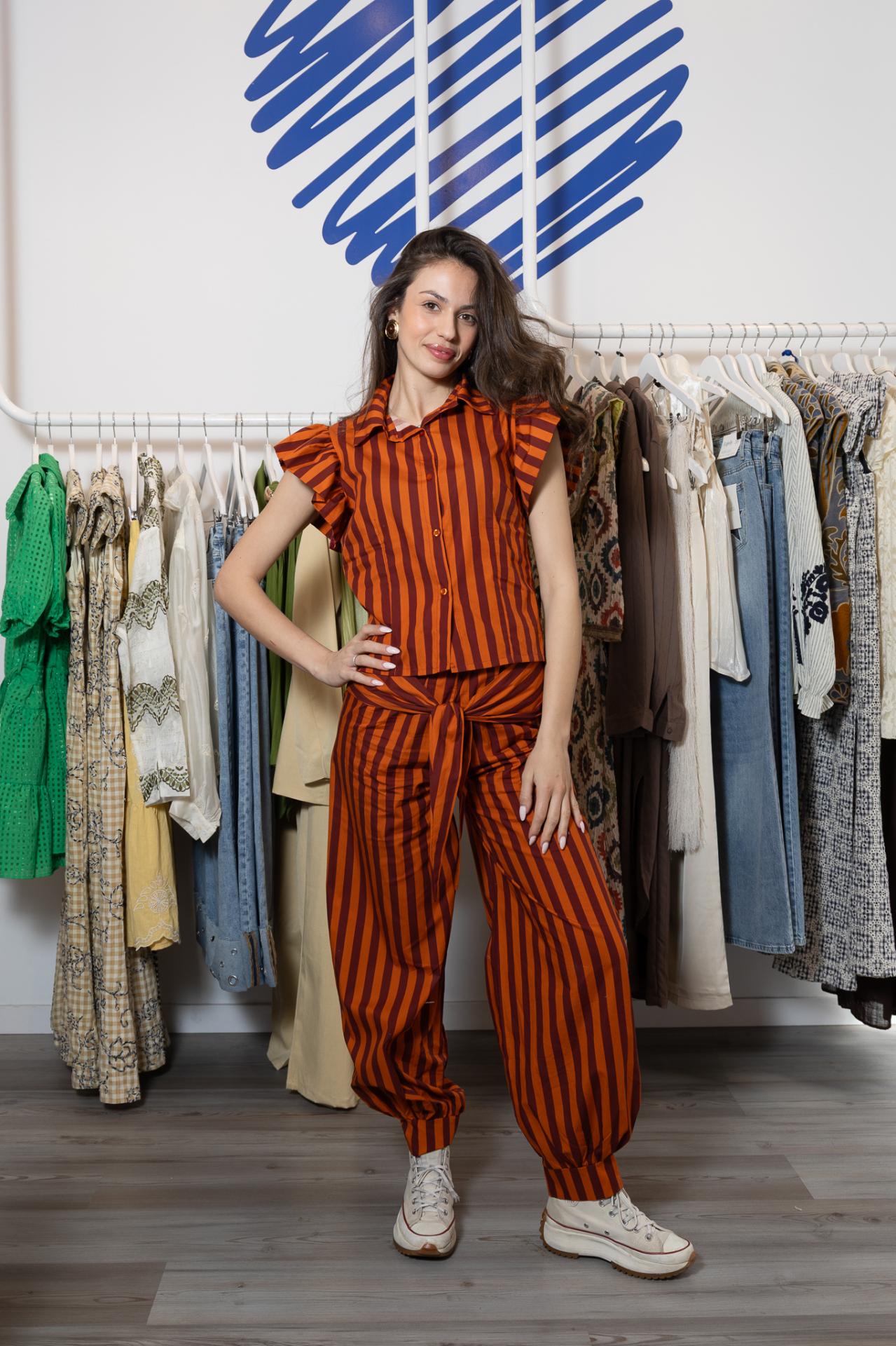 Conjunto a rayas de camisa y pantalón bombacho que se ajusta al tobillo, con lazo para atar a la cintura y goma. La camisa de manguita corta y abotonada, con pequeños volantes sobre los hombros.