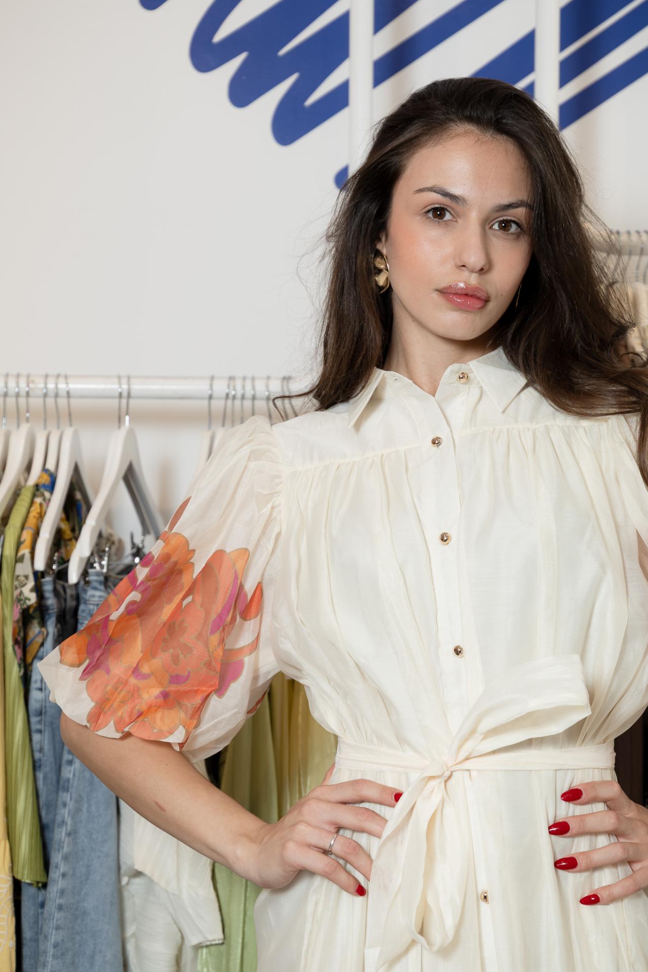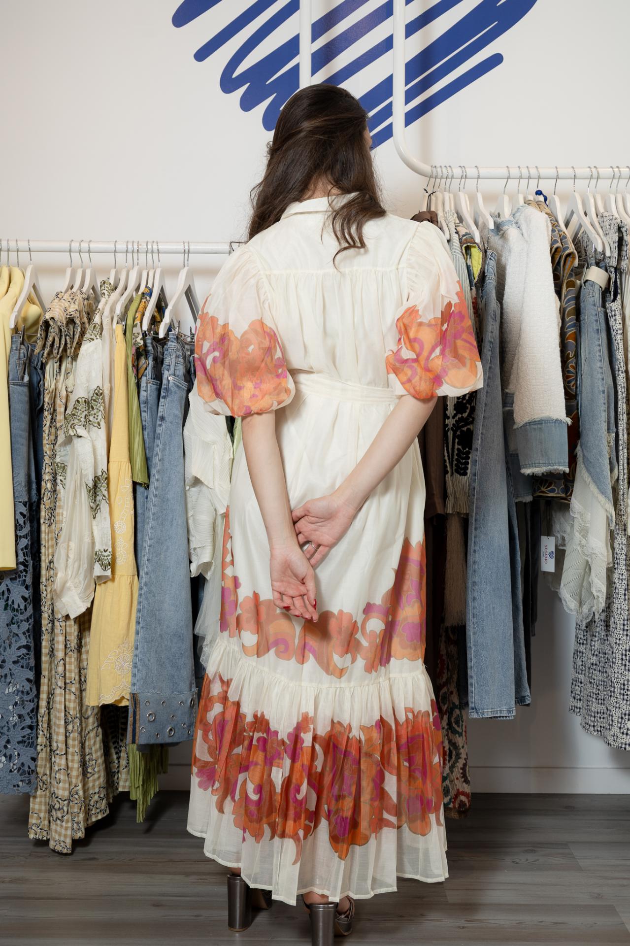 Vestido largo de gasa con botones en dorado, de color blanco con flores estampadas en colores naranjas y rosas en mangas y bajo. Manga corta abullonada. Lleva forro y cinturón a tono para atarlo a la cintura.
