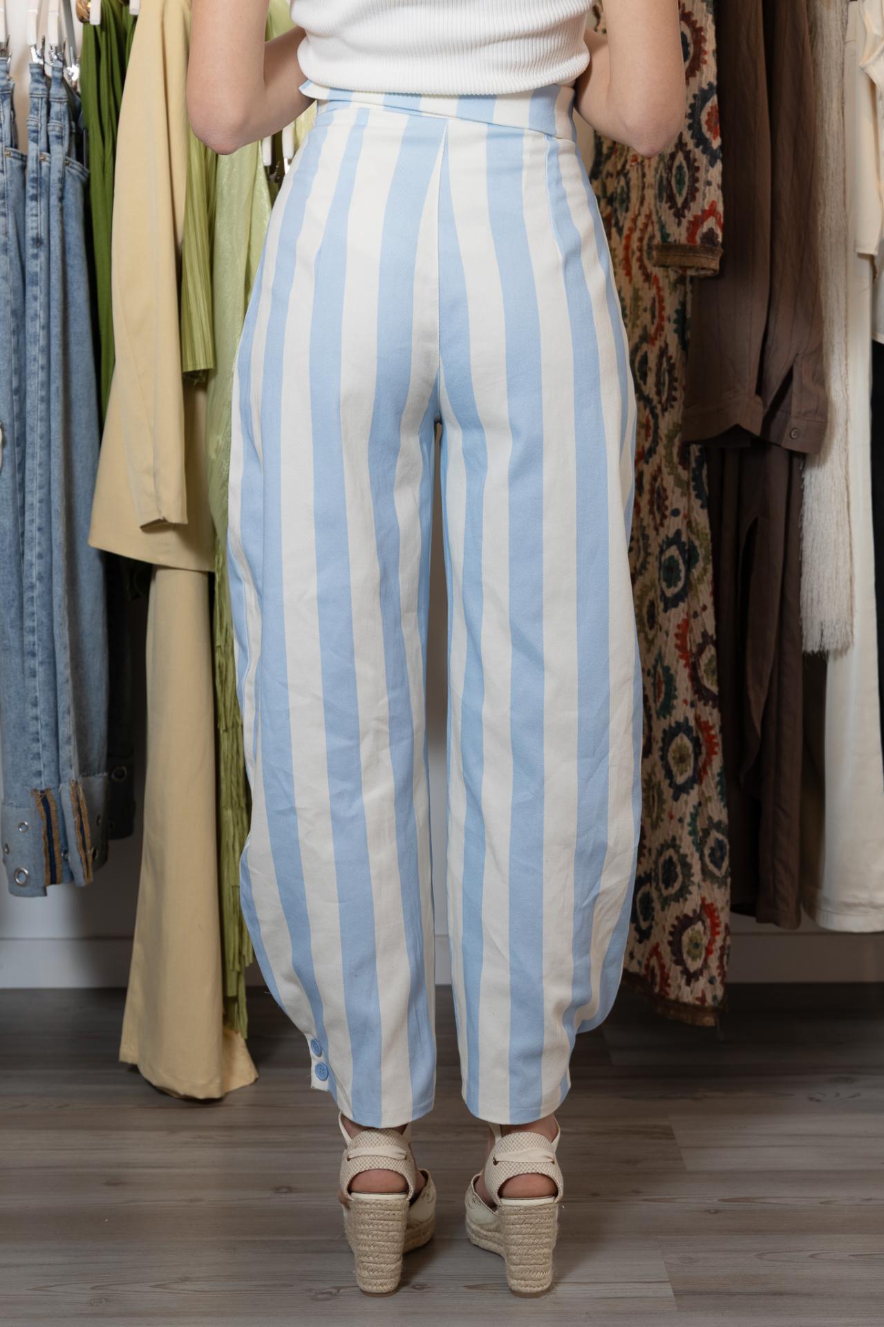 Pantalón a rayas en color azul claro y blanco, de tiro alto y corte globo. Dobladillo en la cintura que se abrocha con botones ladeados hacia la cadera.