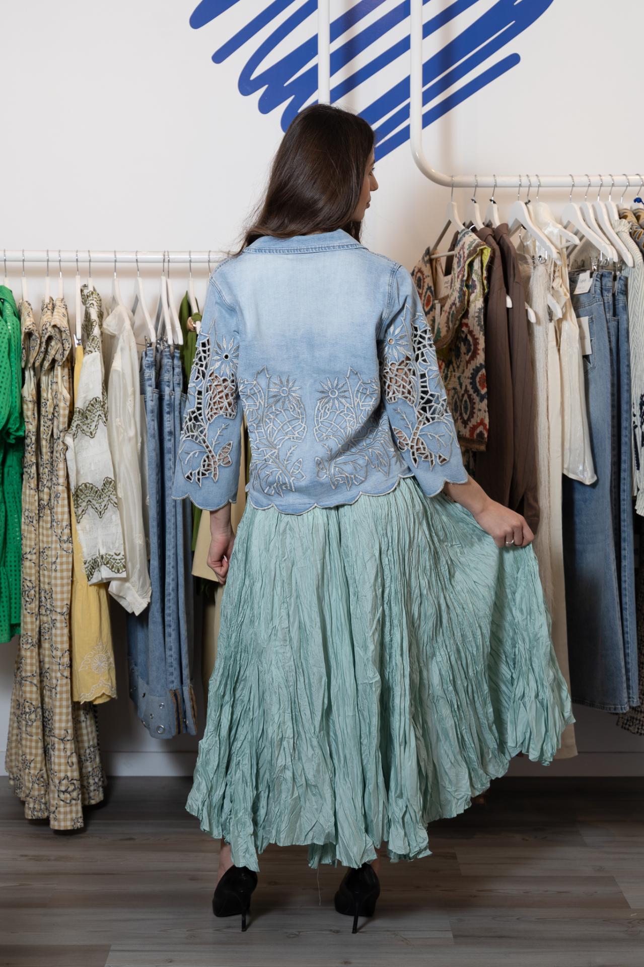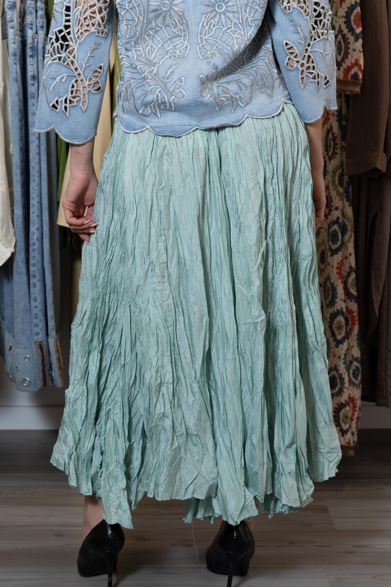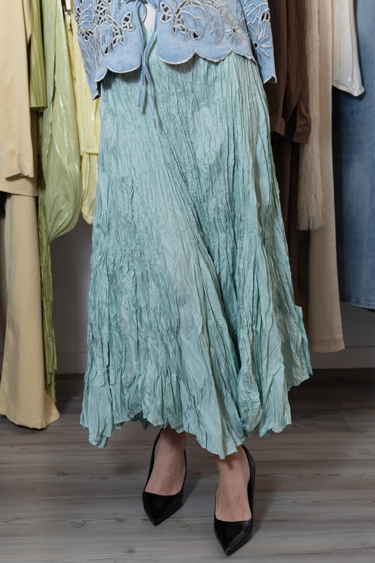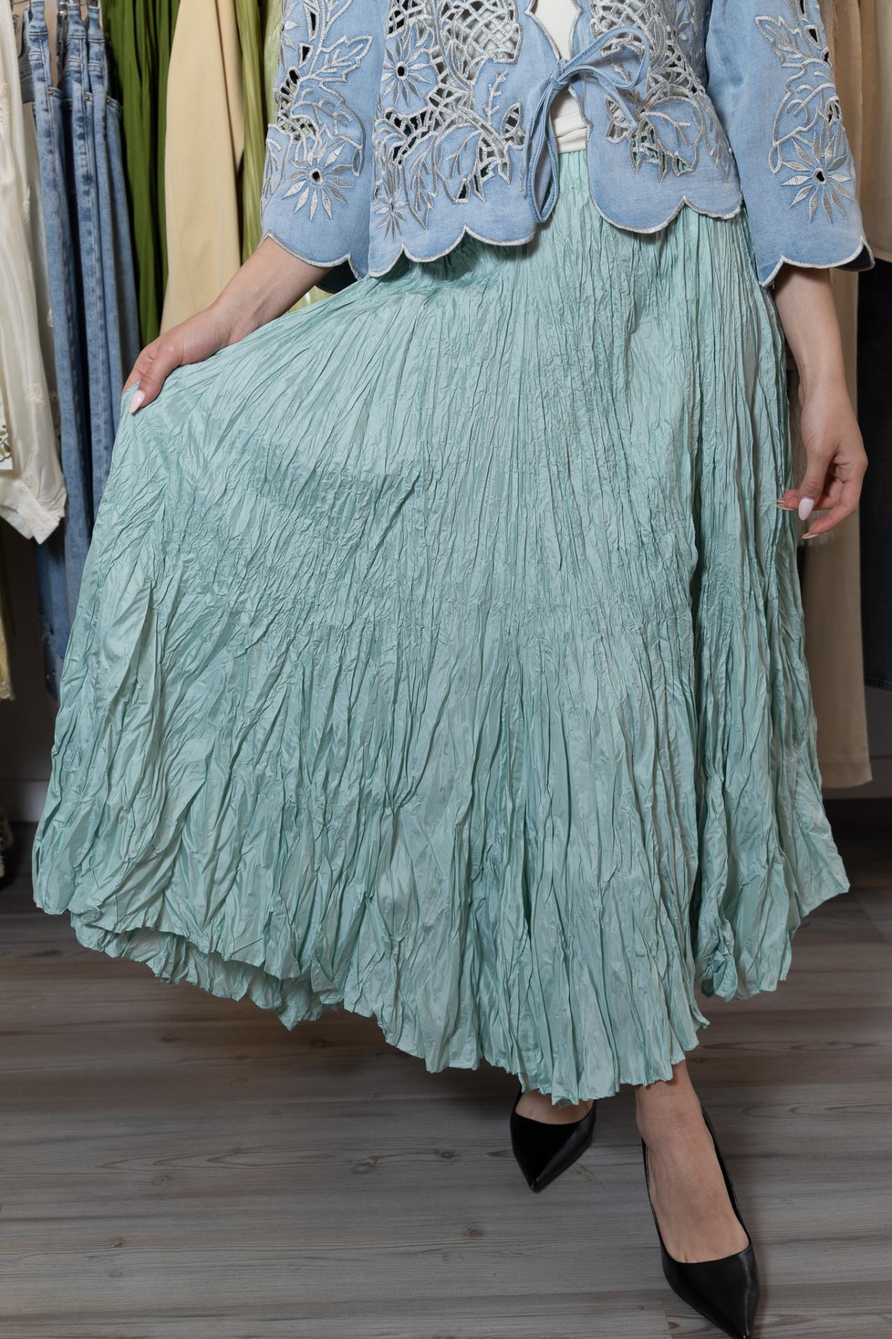 Original falda larga en color aguamarina, de efecto arrugado y con goma en la cintura.