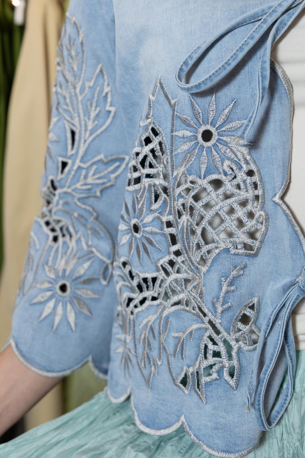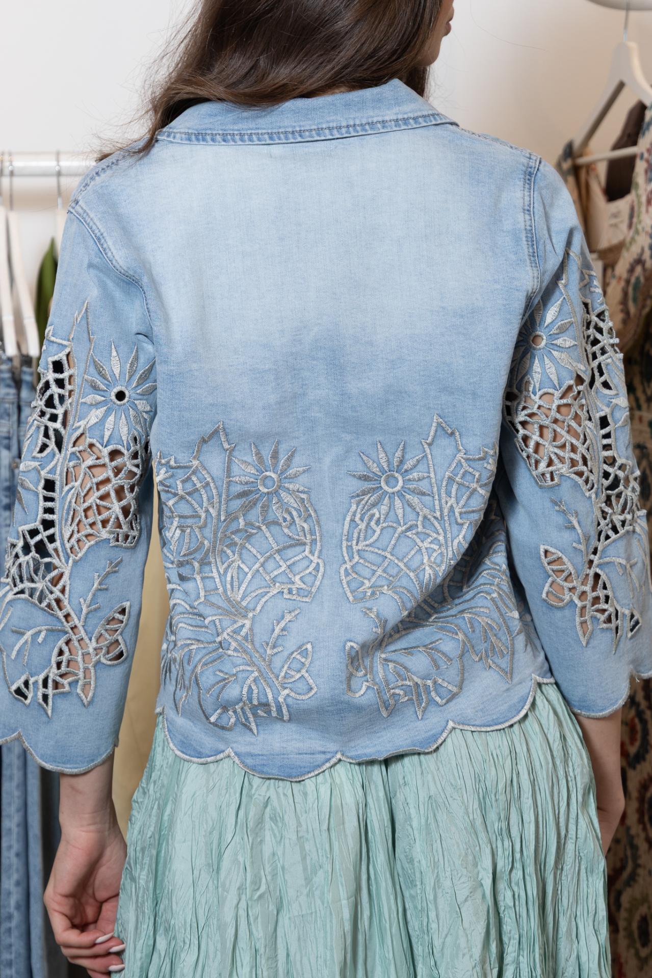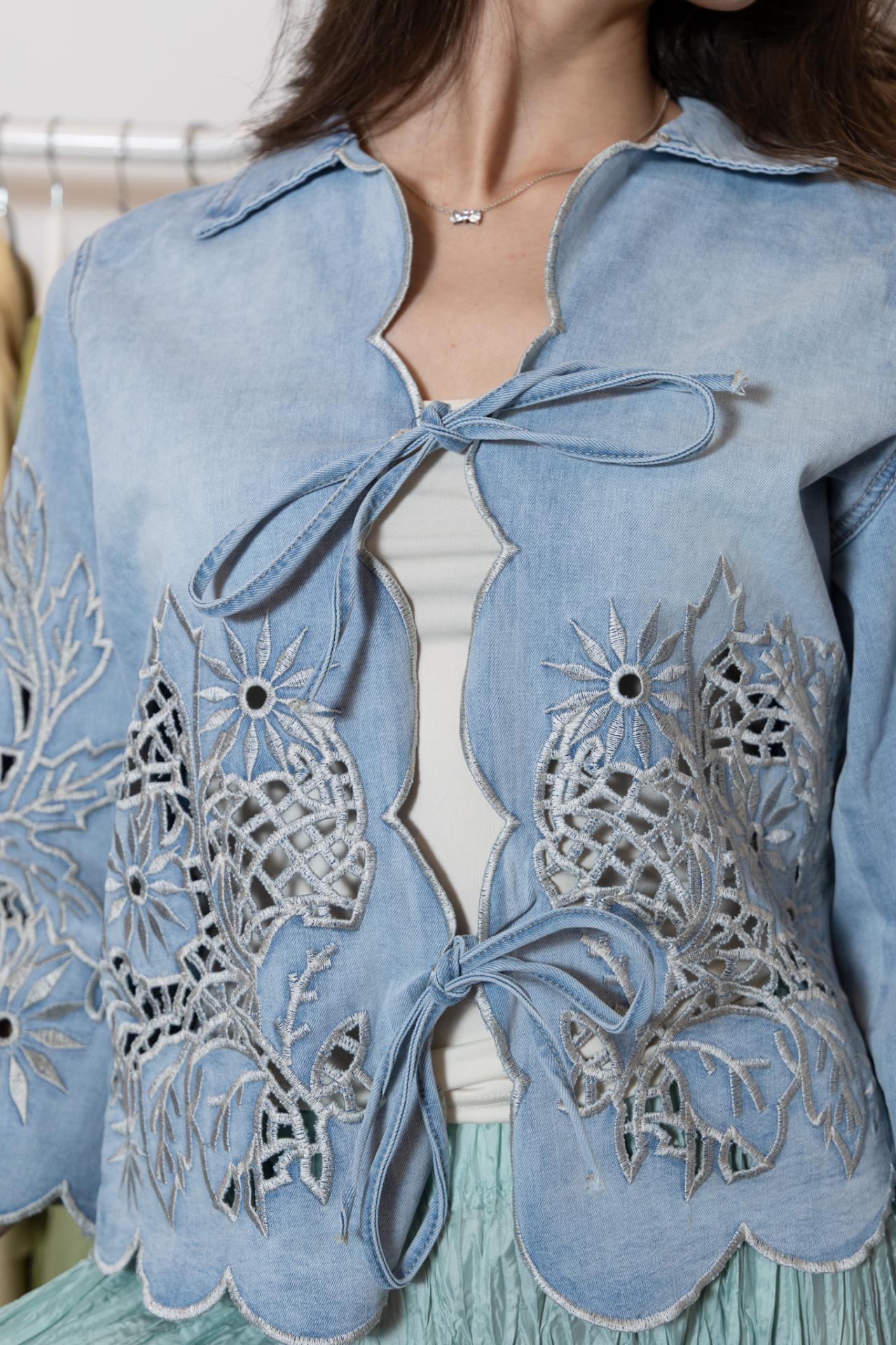 Ideal nuestra chaqueta denim cortita y ligera. Con troquelados y bordados en blanco. Se cierra con dos pequeños lazos en el centro.