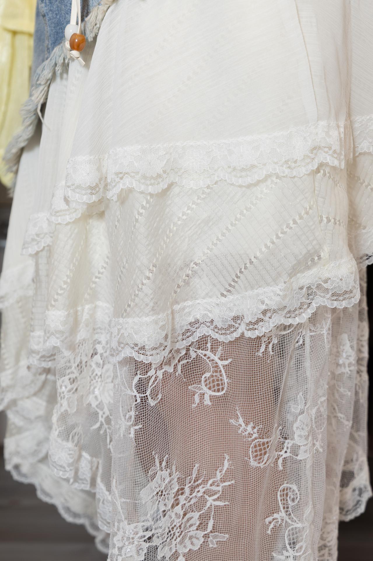 Original falda denim combinada con tela fluida con encajes en color blanco. Con cinturón y pequeño abalorio en tonos beige.