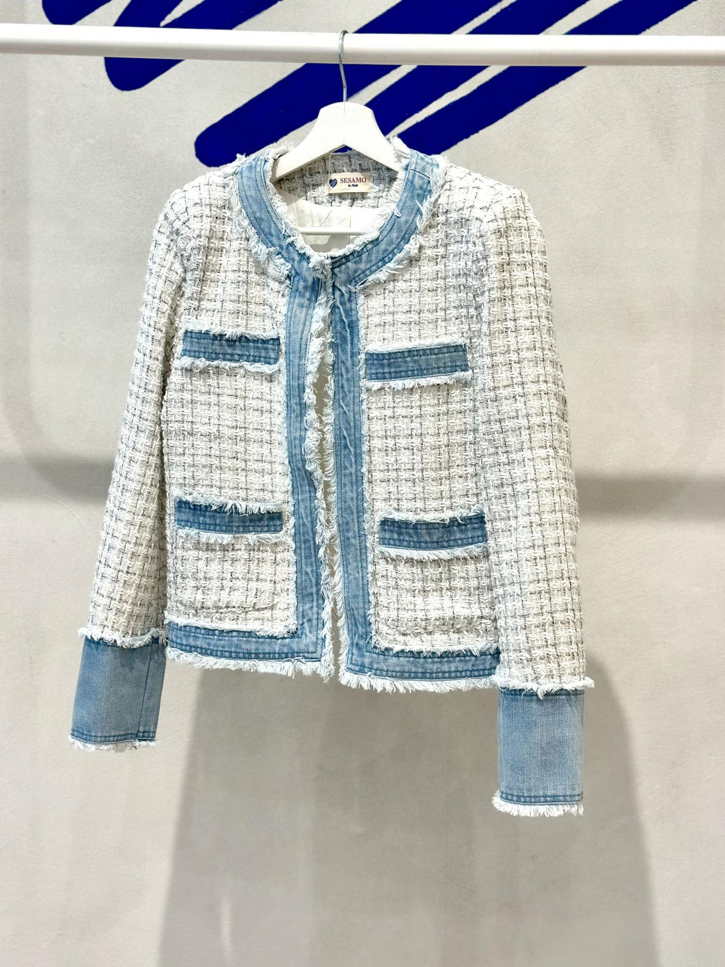 Chaqueta en tweed en blanco, de corte recto y cuello redondeado. Toda ribeteada en tejido denim deshilachado. Bolsillos y puños también en denim. Sin botones, con un único cierre invisible a la altura del cuello.