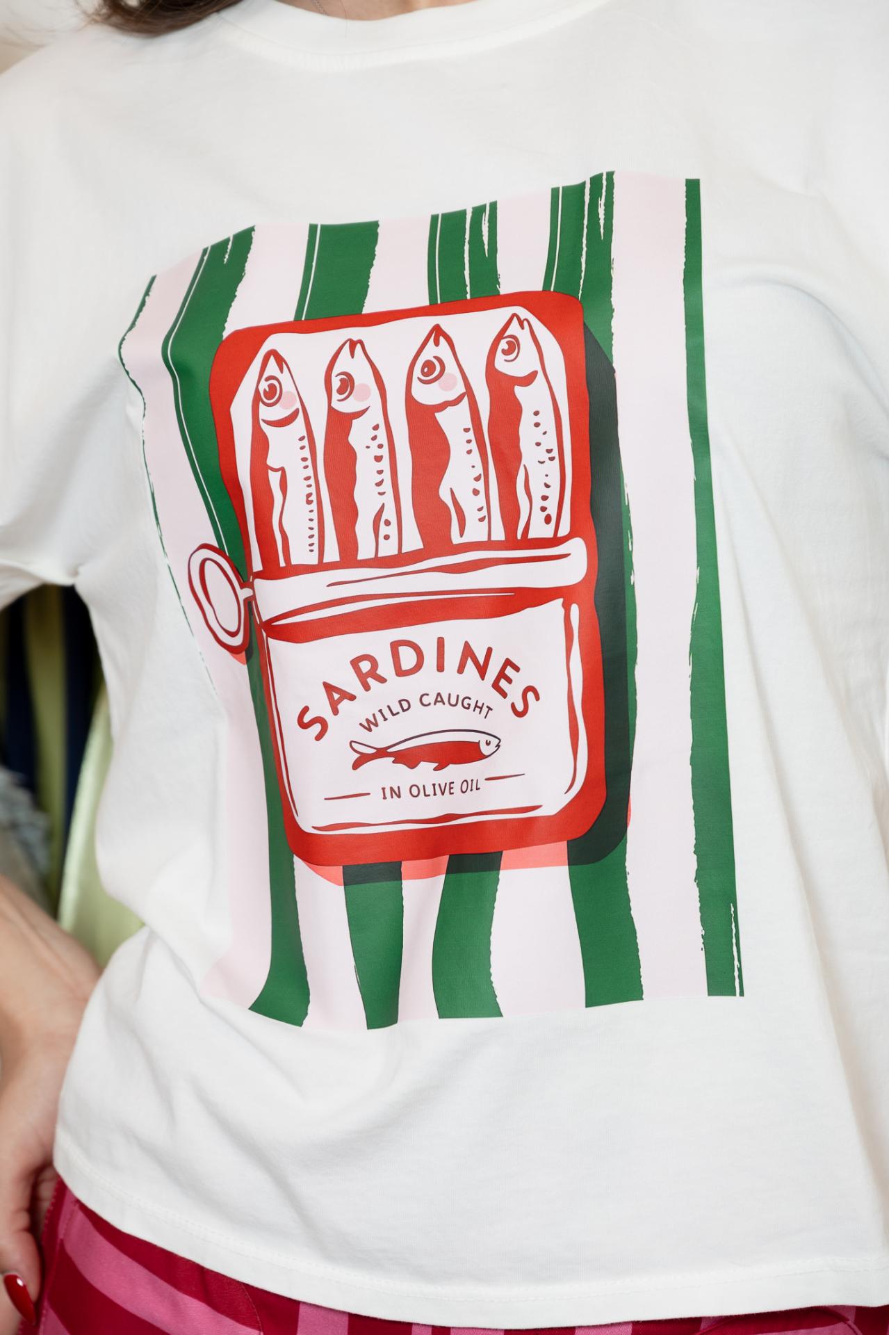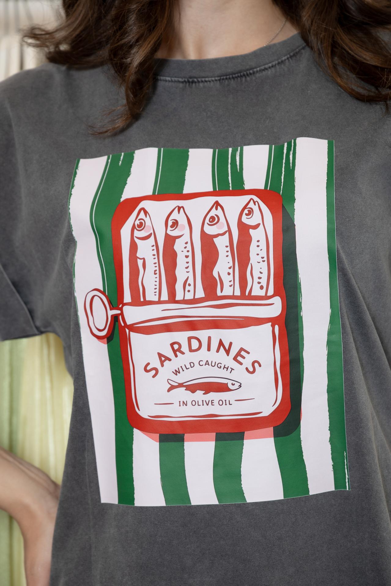 Camiseta de manga corta con estampado de lata de sardinas en fondo verde y rosa. Disponible en color blanco o negro desgastado.