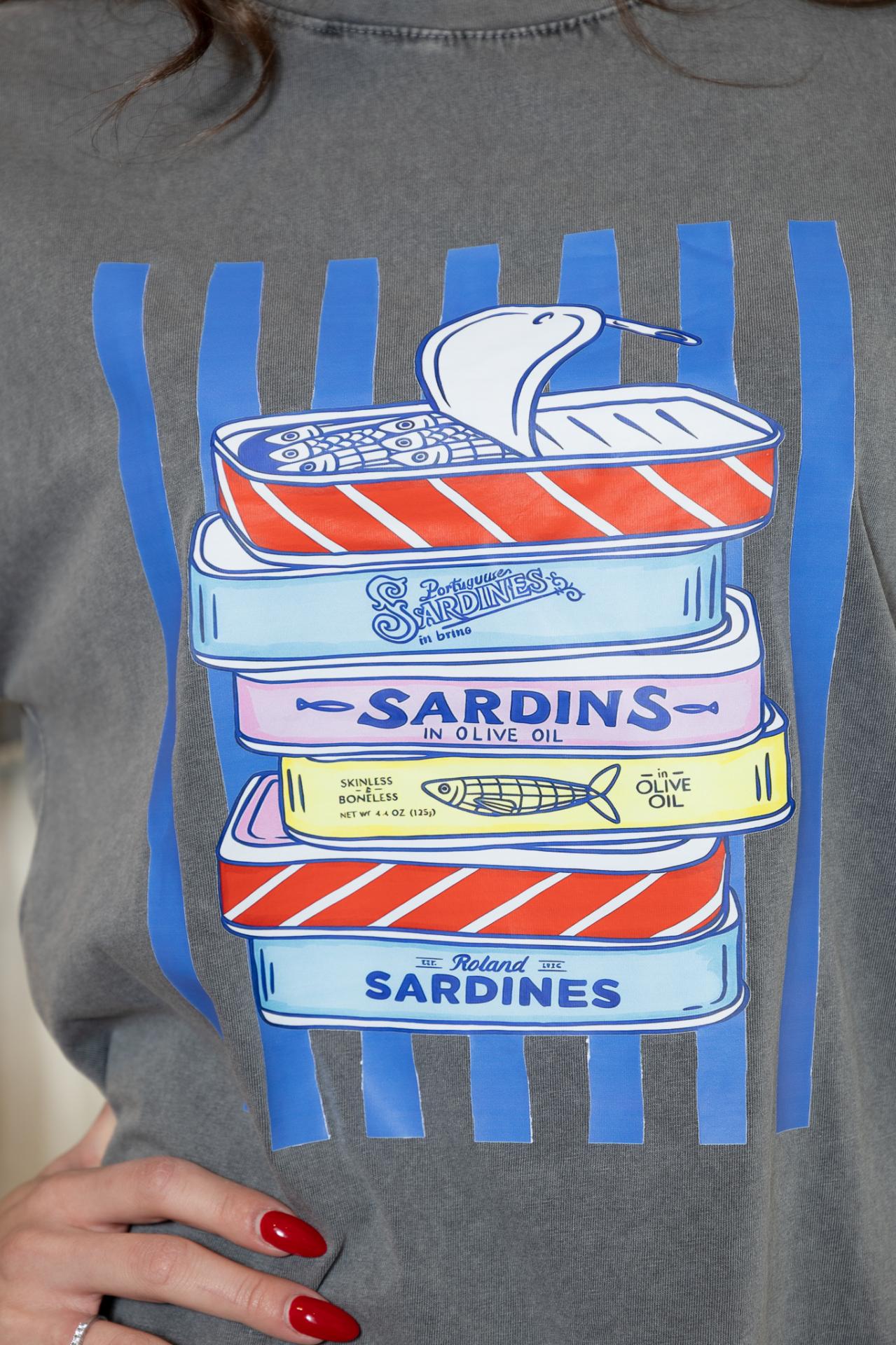 Camiseta de manga corta con estampado de latas de sardinas en fondo de rayas azules. En color negro desgastado.